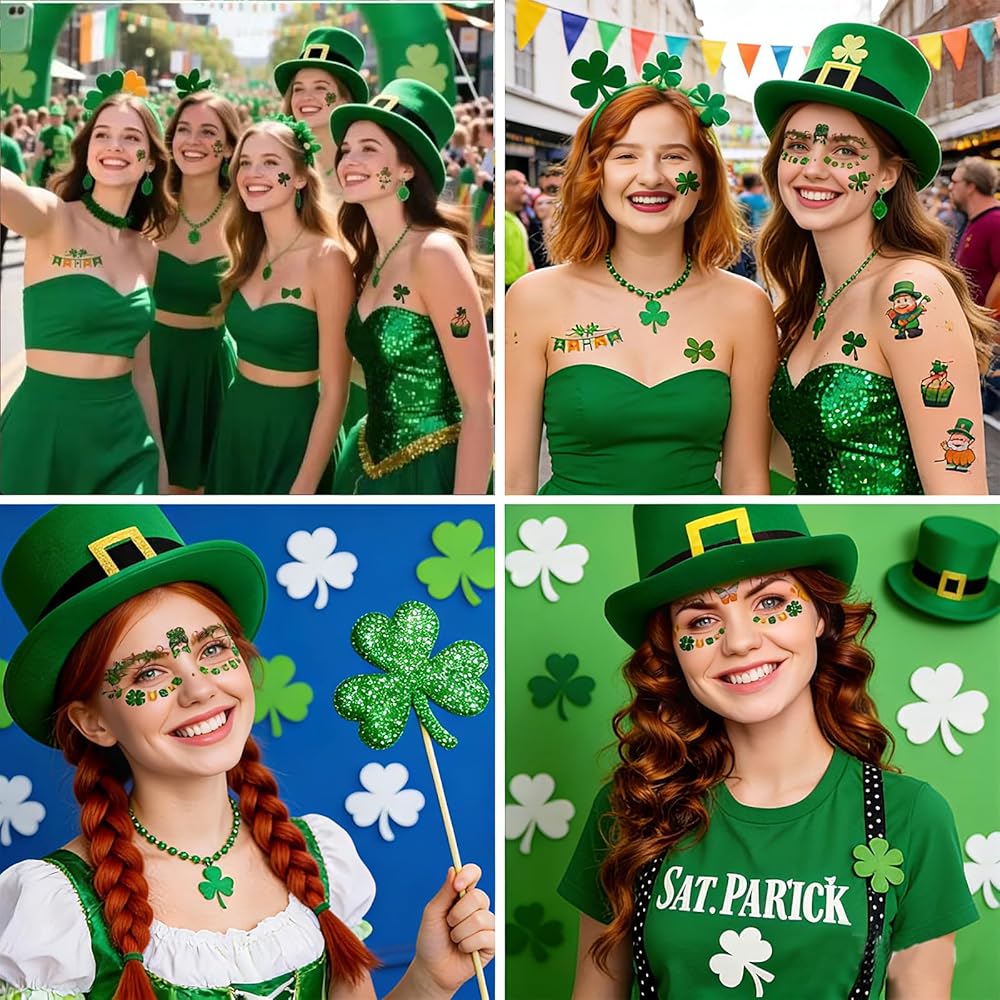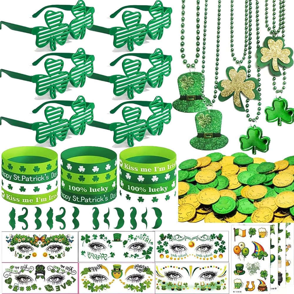 • St Patricks Day Accessorie Set: This set features abundant pieces and diverse styles of st patricks day accessories, including shamrocktemporary tattoos, lucky coins, shamrock necklaces/bracelets, shamrock glasses, clover headbands, green moustaches, silicon bracelets . You can freely mix and match to create unique and stylish festive looks for yourself and your friends
