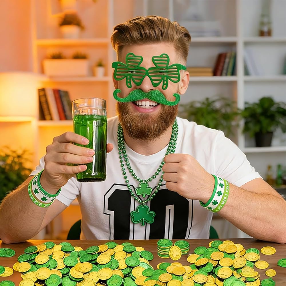 St Patricks Day Accessorie Set: This pack includes 6 different St. Patrick's Day costume accessories, including green beard, silicon bracelets, temporary tattoos, necklaces, shamrock glasses. You can mix and match to create unique and stylish outfits for yourself and your friends.