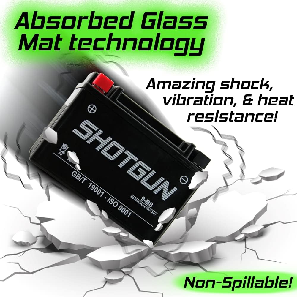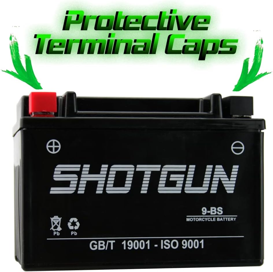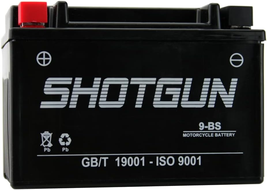 Shotgun brand batteries are affordable Adavcned AGM technology YTX9-BS Sealed ShotGun Powersport Battery For Honda EU3000 Generator 0-2011. Our sealed motorcylce batteries feature Absorbed Glass Mat technology (AGM for short). This design dramatically improves a battery's performance in the following areas: A) True sealed and maintenance-free design, you'll never have to check or add electrolyte again, unlike conventional batteries which require periodic fluid checks. B) Liquid-free AGM design, will not leak or corrode on expensive paint and chrome, and also eliminates corrosion around the battery terminals. C) AGM batteries have less internal resistance which allows them to produce more discharge current (cold cranking amperage) vs. comparable conventional "wet" batteries,and AGM batteries also recharge faster D) Better resistance to both heat and vibration, a major cause of failure in conventional motorcycle batteries E) Much slower self-discharge rate, (3% vs.15% per month) means longer periods between battery recharging over periods of non-use, like winter months or vacations. Our sealed motorcycle batteries feature Absorbed Glass Mat technology (AGM for short) Cross Reference: Champion 9BS, Deka ETX9, GS (JBS) GTX9-BS, GS (ZYI) GTX9-BS, Motocross M329BS/M429BS, Napa 740-1825, Sears 44025. Wal-Mart ES9BS, Yacht CTX9-BS, YTX9-BS, Powersonic PTX9-FS GT9B4-4
