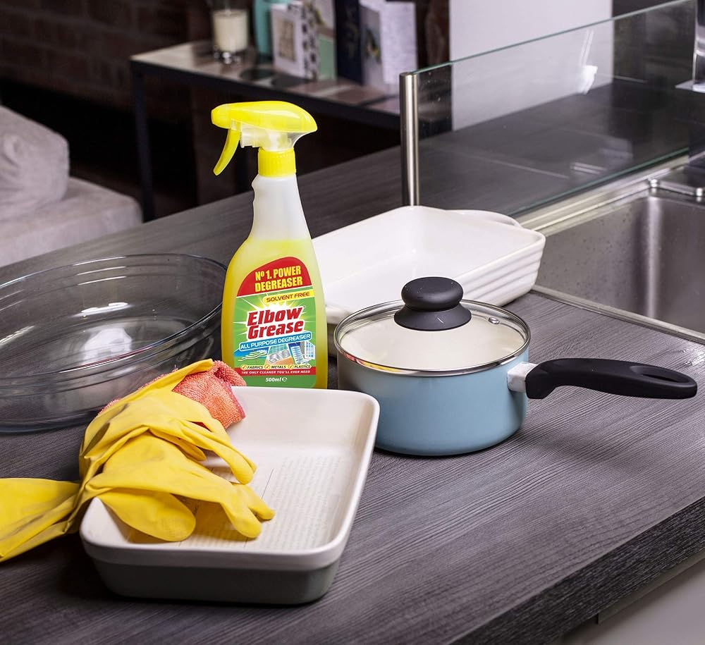 The Elbow Grease All-Purpose Degreaser is perfect for removing tough grease stains from kitchen and bathroom surfaces, fabrics, carpets, plastics and even engines and machinery