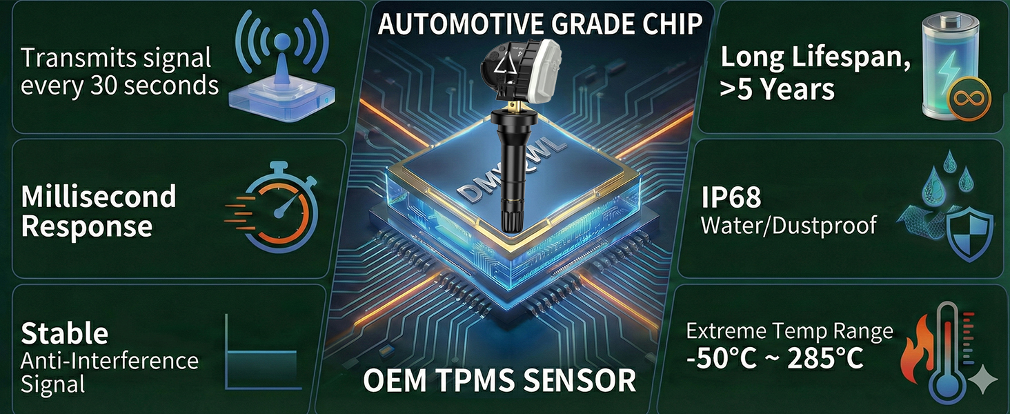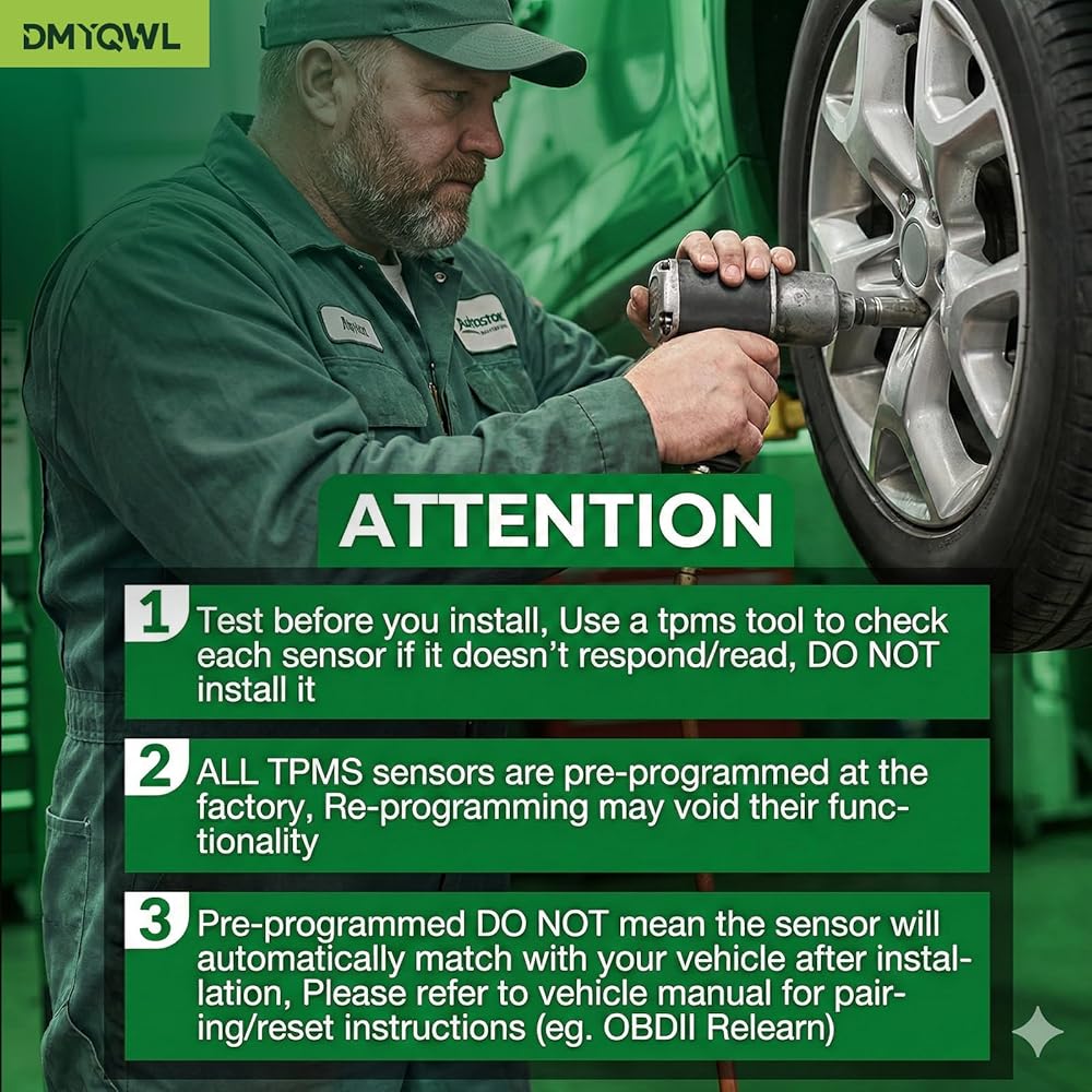🔧[مبرمج مسبقًا]: مبرمج مسبقًا في المصنع - بدون تشفير أو رسوم إضافية؛ | تثبيت لمدة 30 دقيقة باستخدام أداة مسح TPMS؛ | يحافظ على ضغط الإطارات الأمثل لتقليل مقاومة التدحرج؛ | يساعد على تحسين كفاءة استهلاك الوقود وإطالة عمر الإطارات.