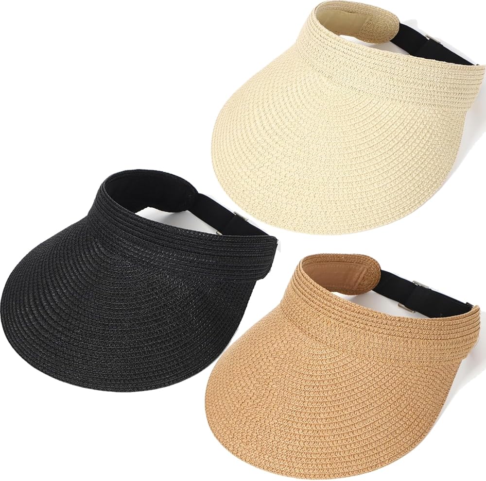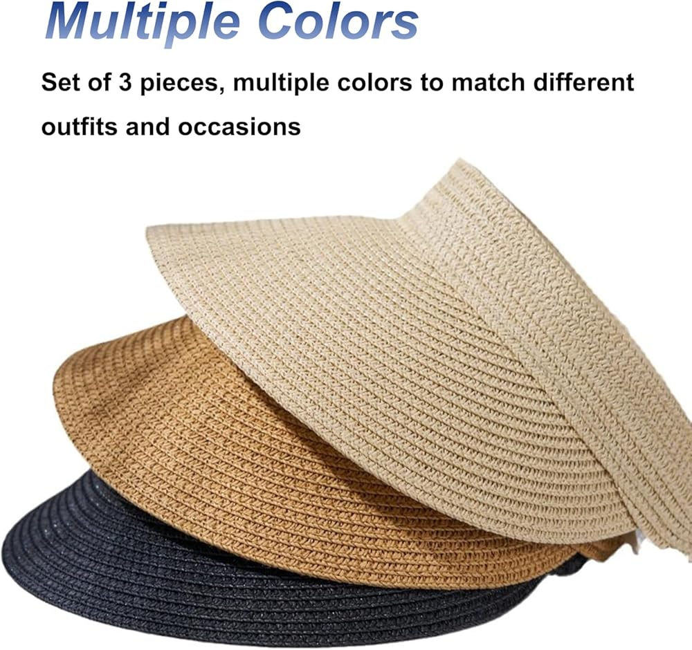 3 عبوات من القش قبعة للوقاية من الشمس للنساء في الصيف للحماية من الأشعة فوق البنفسجية بحافة واسعة على شكل ذيل حصان من القش قبعة الشاطئ للسيدات على طراز قبعة الجولف أقنعة الشمس باللون الأسود