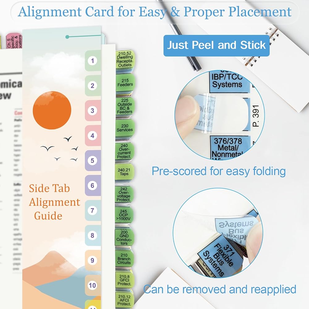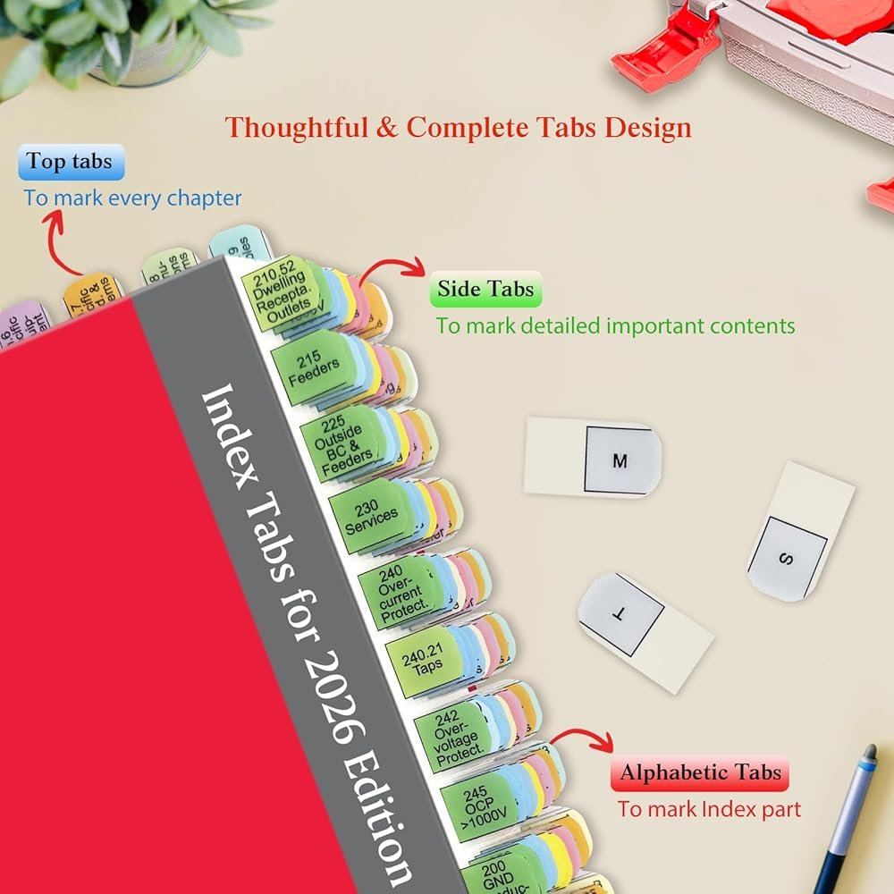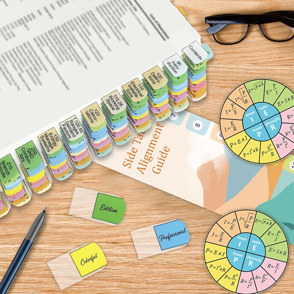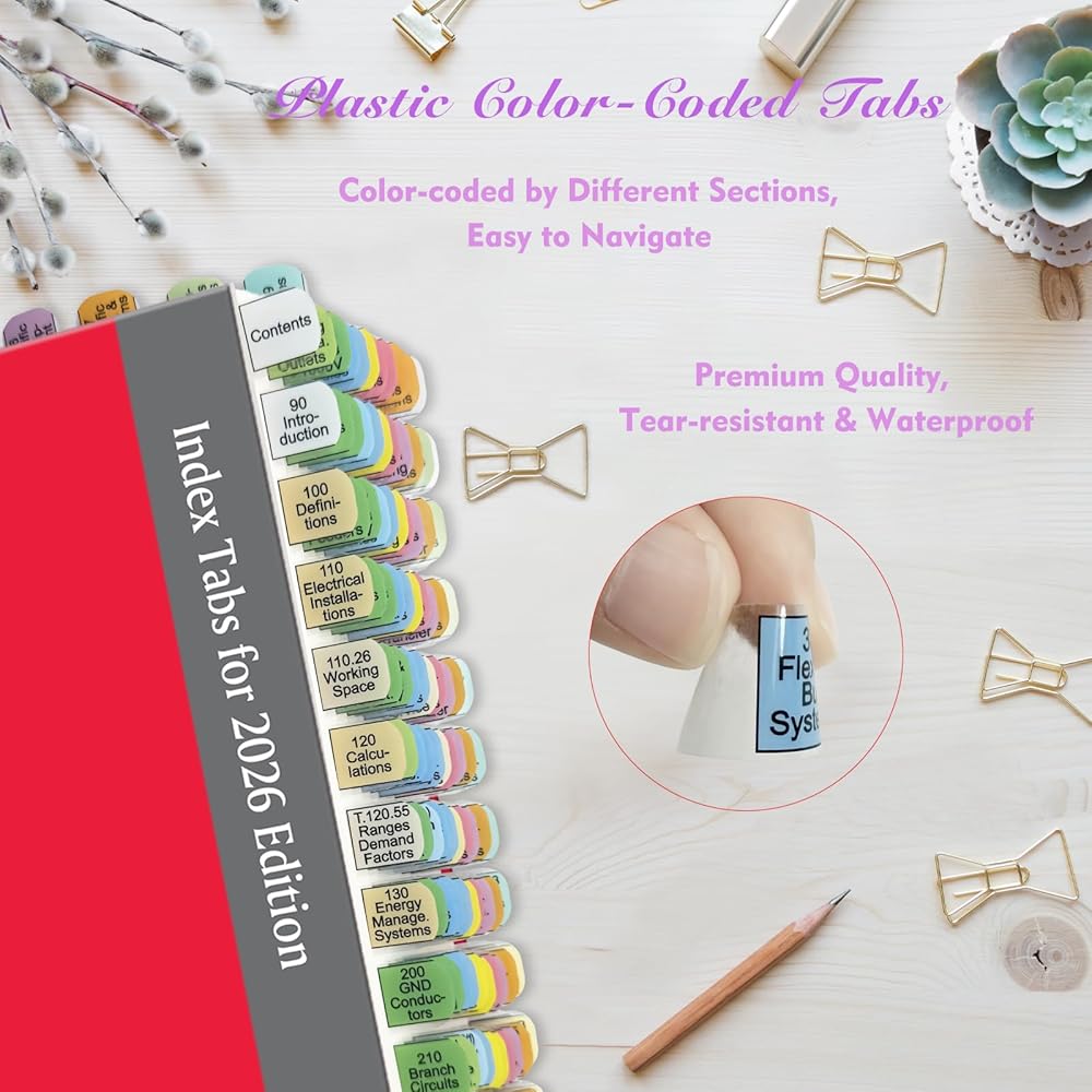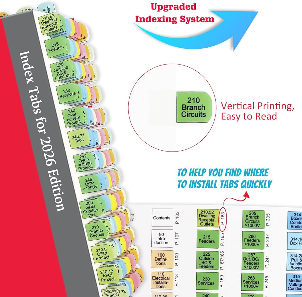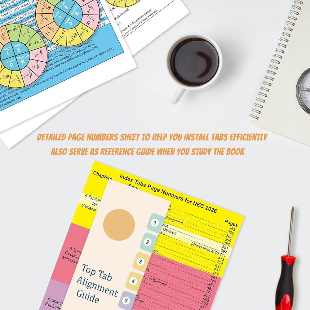 The package contains a complete set of NEC Tabs for the Softbound, Spiral, Loose-leaf, or Handbook Edition of the 2026 National Electrical Code, but the page numbers on the ‘Page Numbers Sheet' are based on the Softbound and Spiral code book, please make sure you stick the tabs to the right pages.