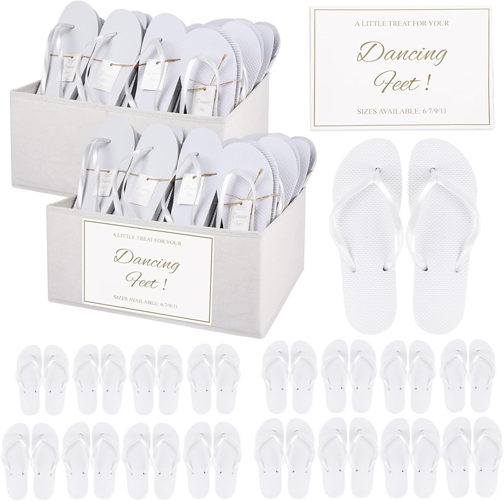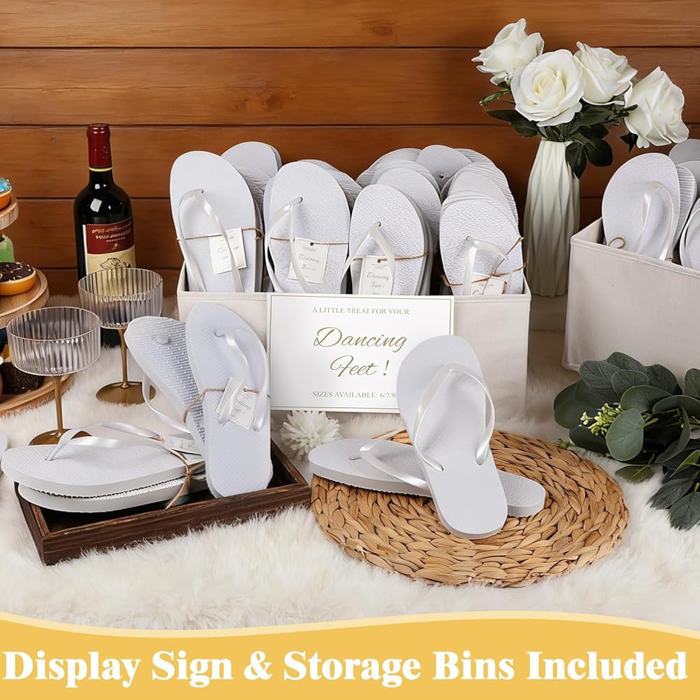 مجموعة 48 زوجًا من شبشب ضيوف حفل الزفاف، شبشب أبيض للاستعمال مرة واحدة مع 2 صندوق تخزين قابل للطي من القطن والكتان، لافتة عرض واحدة لصنادل حفلات حمام السباحة والشاطئ