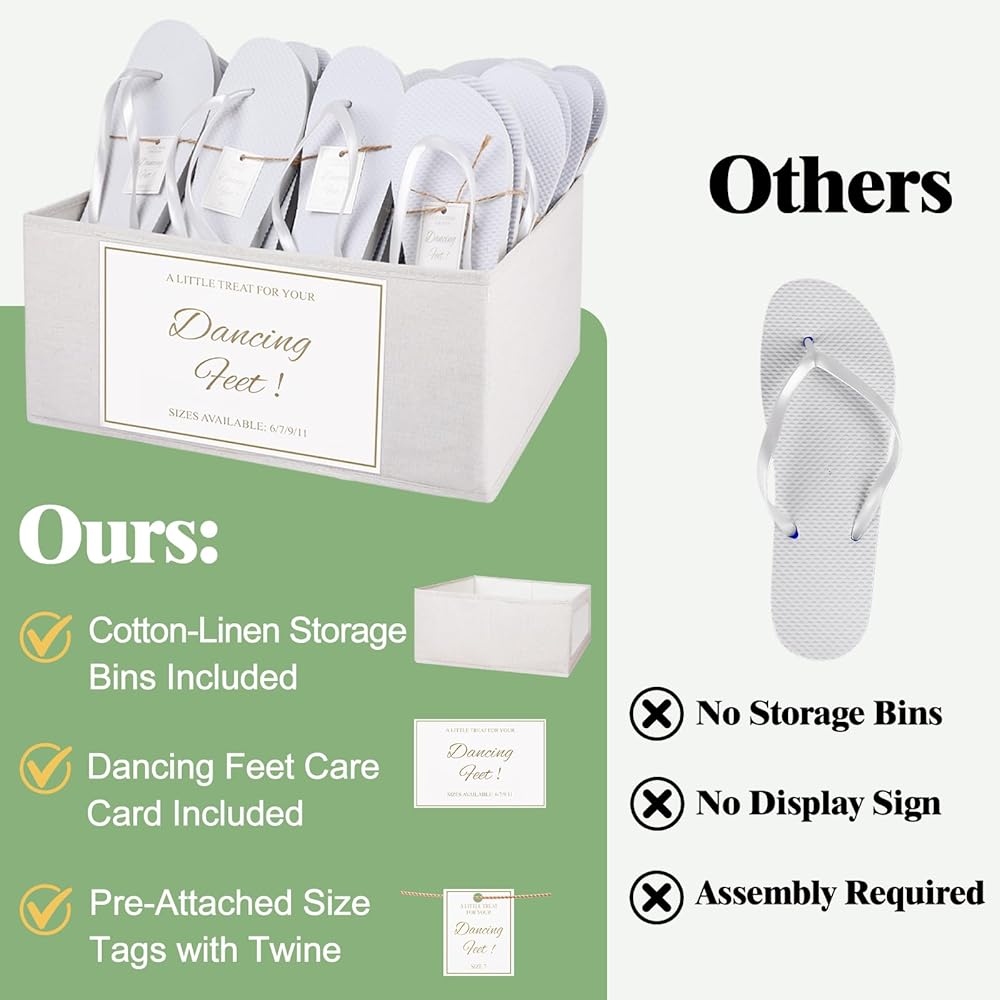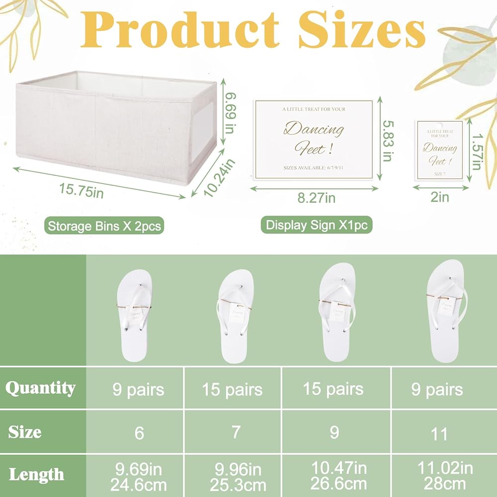 الملحقات المتضمنة: تشتمل مجموعة الشبشب لدينا أيضًا على لافتة عرض A5 أنيقة (5.83 بوصة × 8.27 بوصة / 14.8 سم × 21 سم) وسلتين تخزين من القطن والكتان قابلين للطي (40 × 26 × 17 سم). وهذا يلغي متاعب شراء لوازم تخزين إضافية بشكل منفصل، مما يجعل التحضير للمناسبات الخاصة بك أكثر ملاءمة
