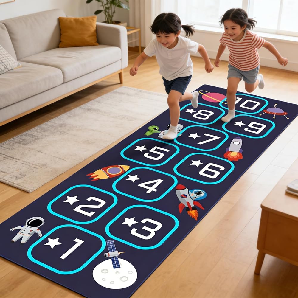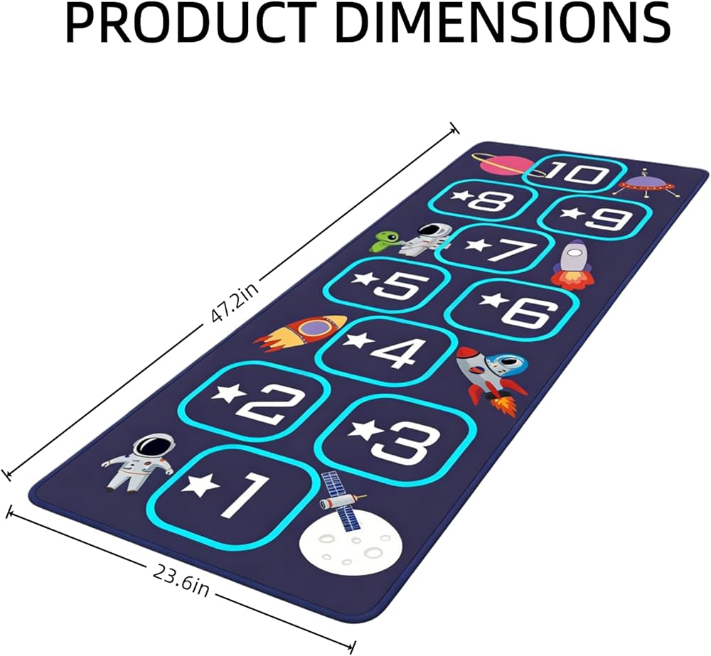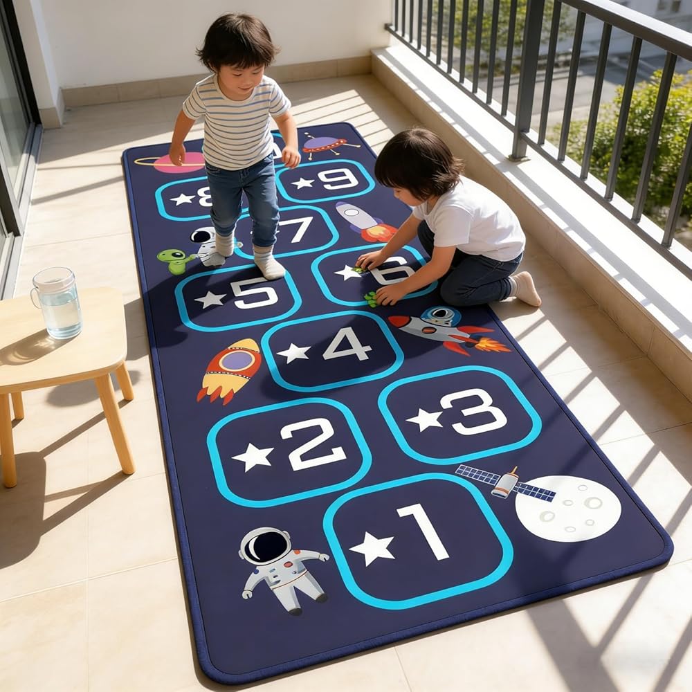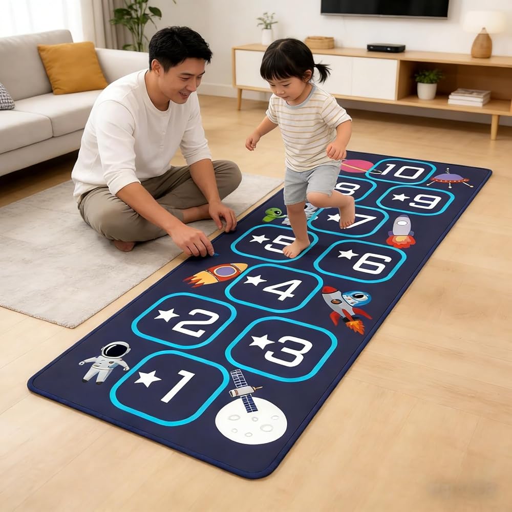 Hopscotch mat crafted from premium materials, this hop scotch inside rug for kids features a soft, high-density fabric that is gentle on children's bare feet while ensuring long-lasting durability. Hopscotch rugs for kids indoor material is stain-resistant,fade-resistant, and highly durable, standing up to daily play, jumping, and active use. It is also completely machine washable for easy cleaning and quick drying, making hop scotch rug for kids a practical choice that maintains its quality through years of fun.