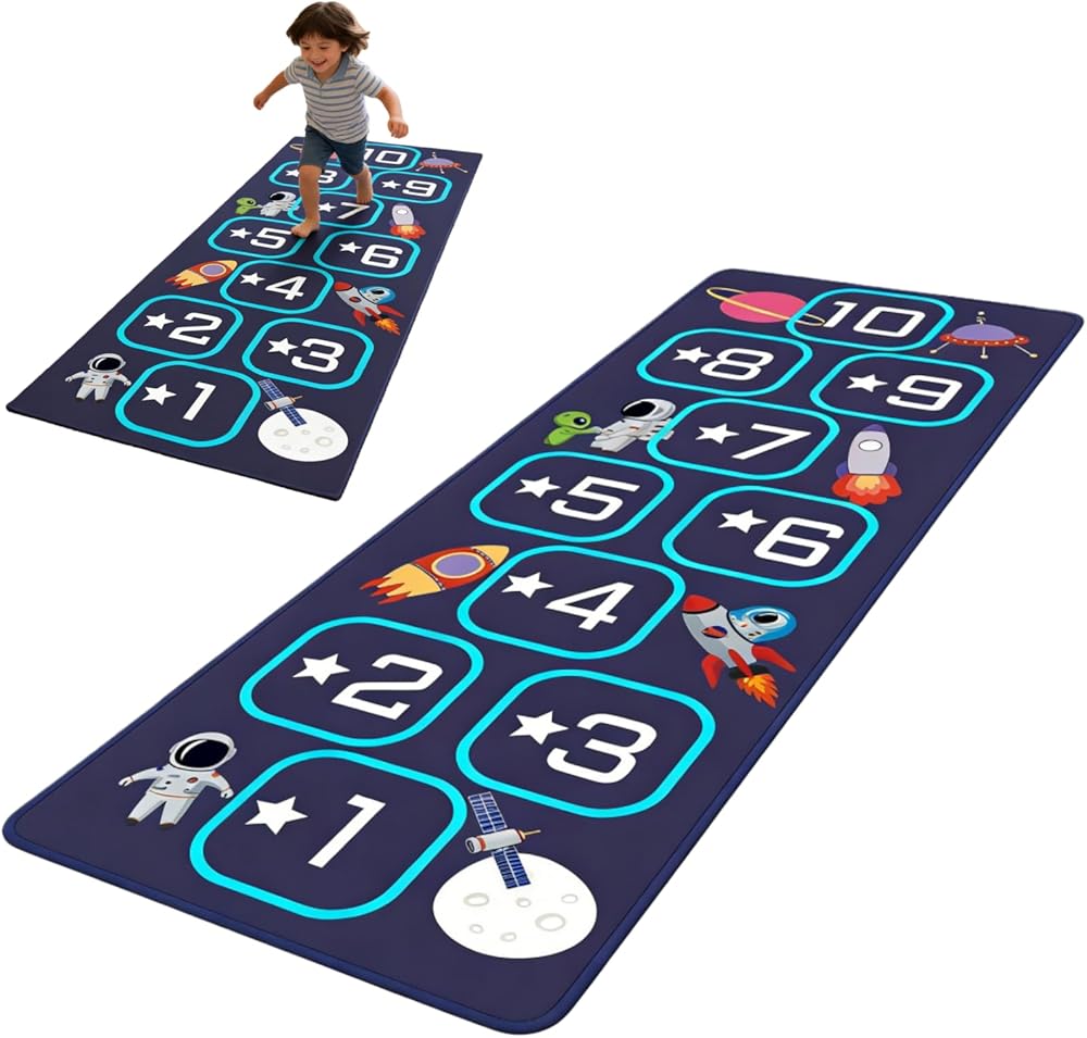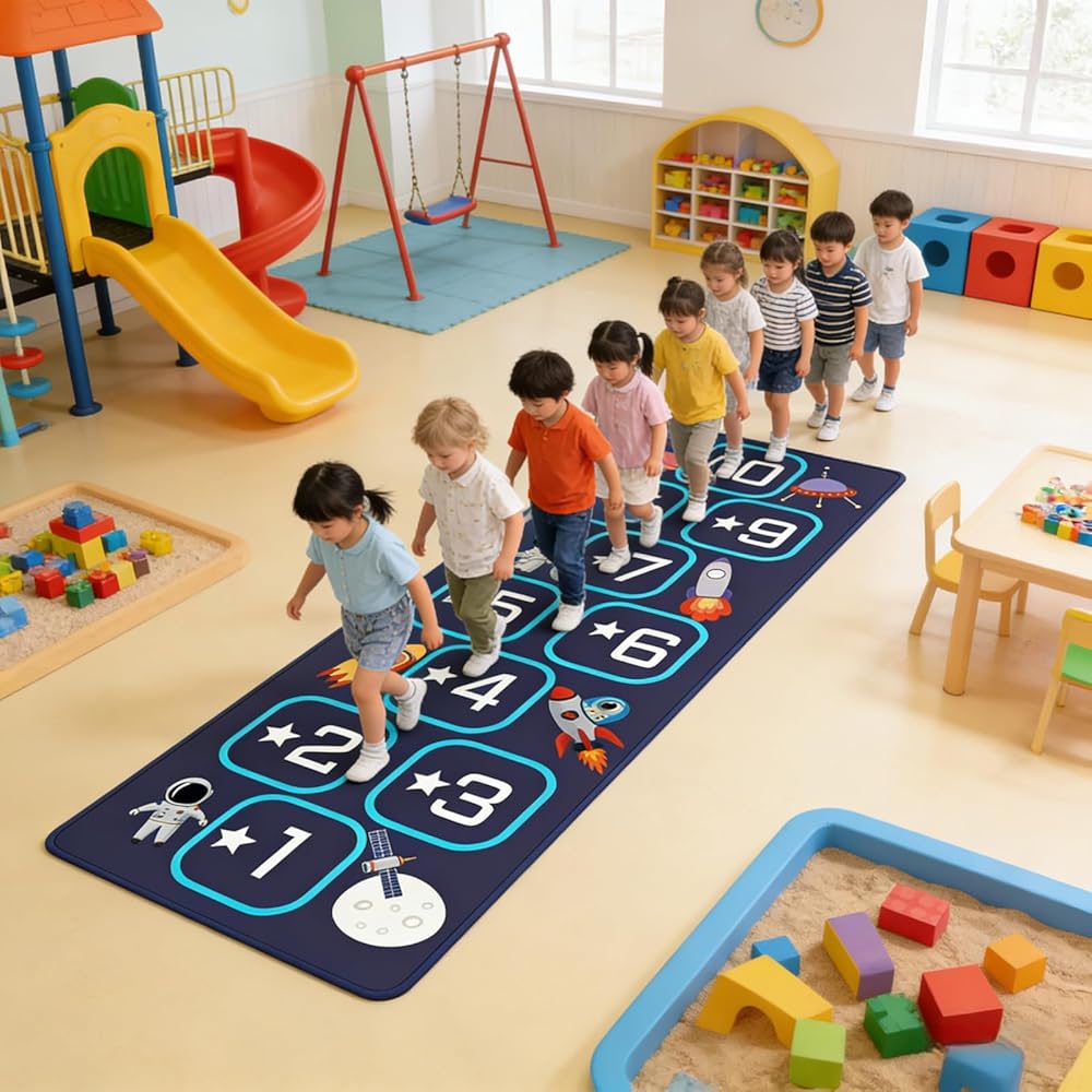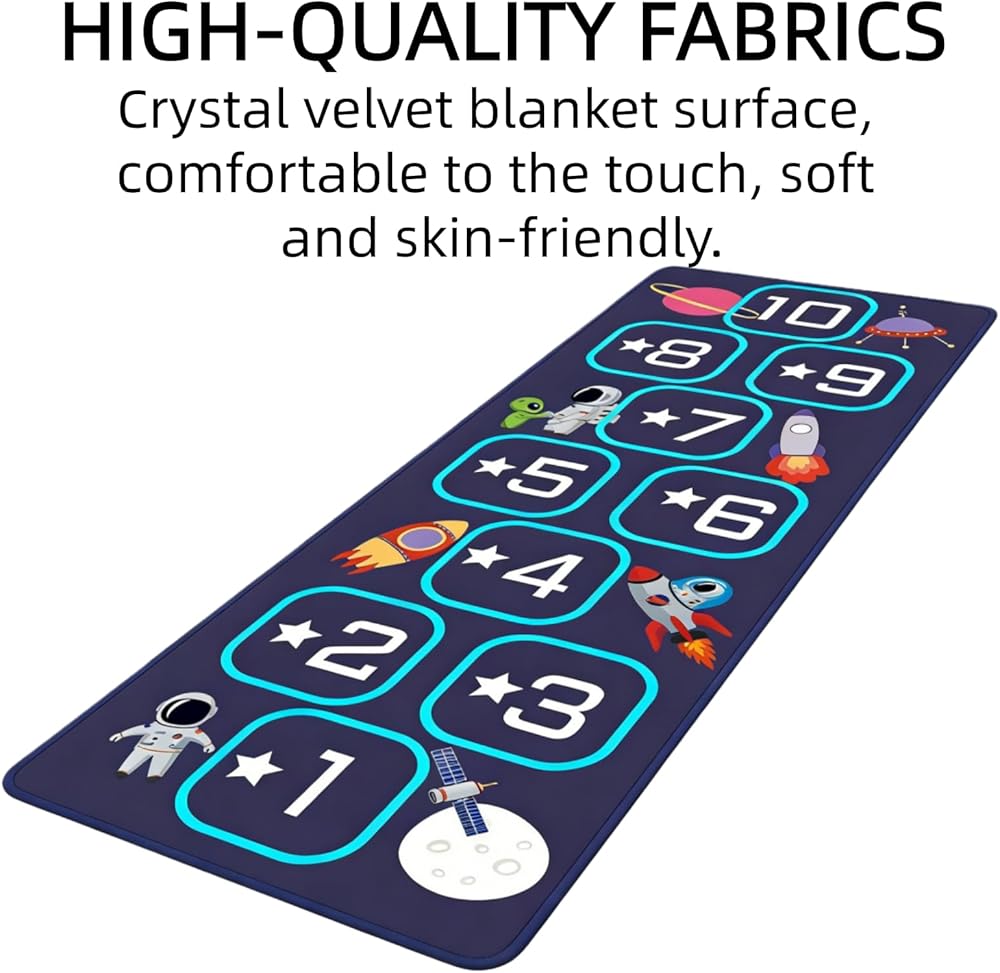 Hopscotch mat crafted from premium materials, this hop scotch inside rug for kids features a soft, high-density fabric that is gentle on children's bare feet while ensuring long-lasting durability. Hopscotch rugs for kids indoor material is stain-resistant,fade-resistant, and highly durable, standing up to daily play, jumping, and active use. It is also completely machine washable for easy cleaning and quick drying, making hop scotch rug for kids a practical choice that maintains its quality through years of fun.