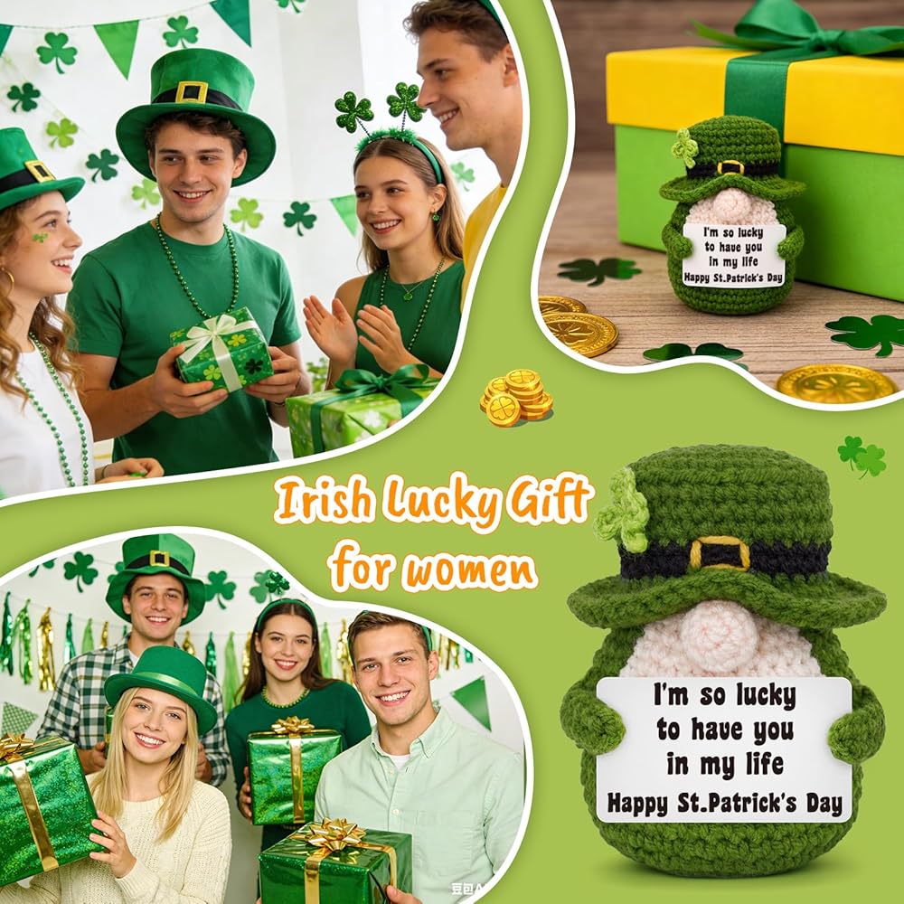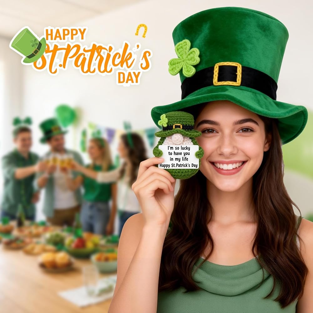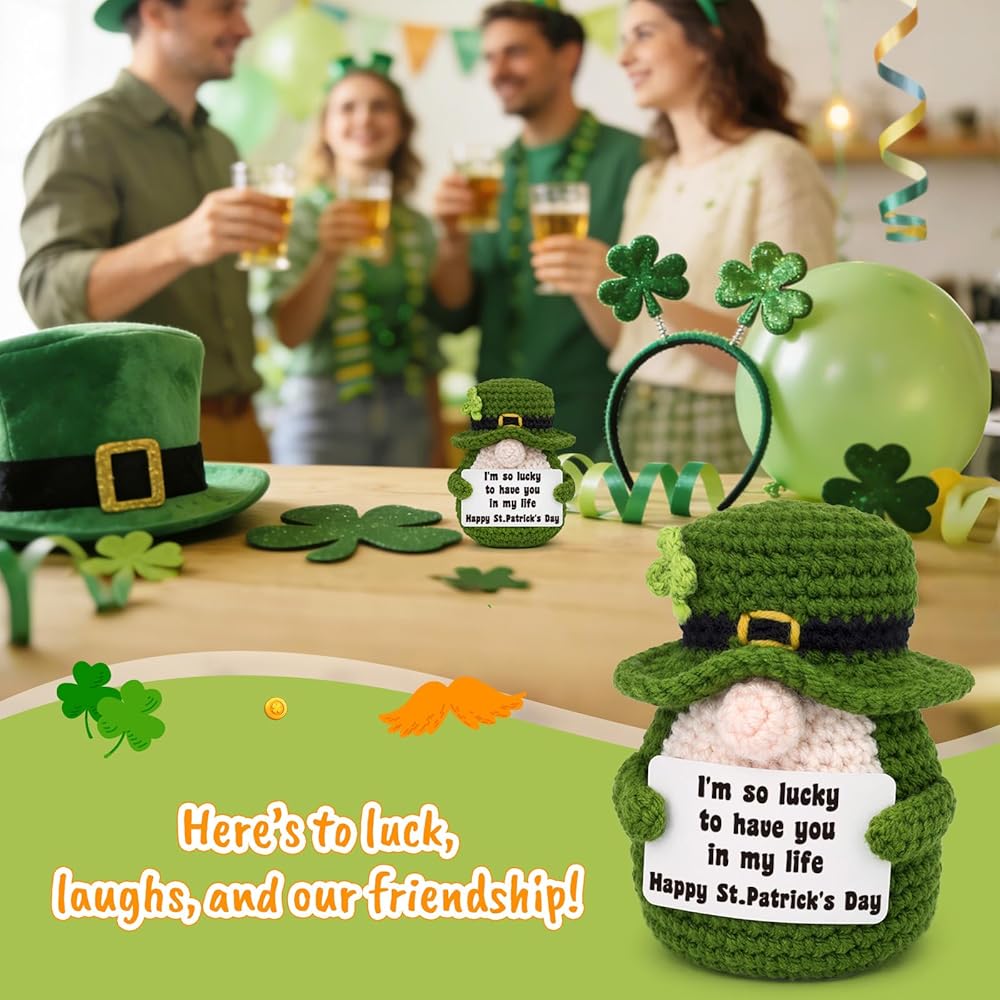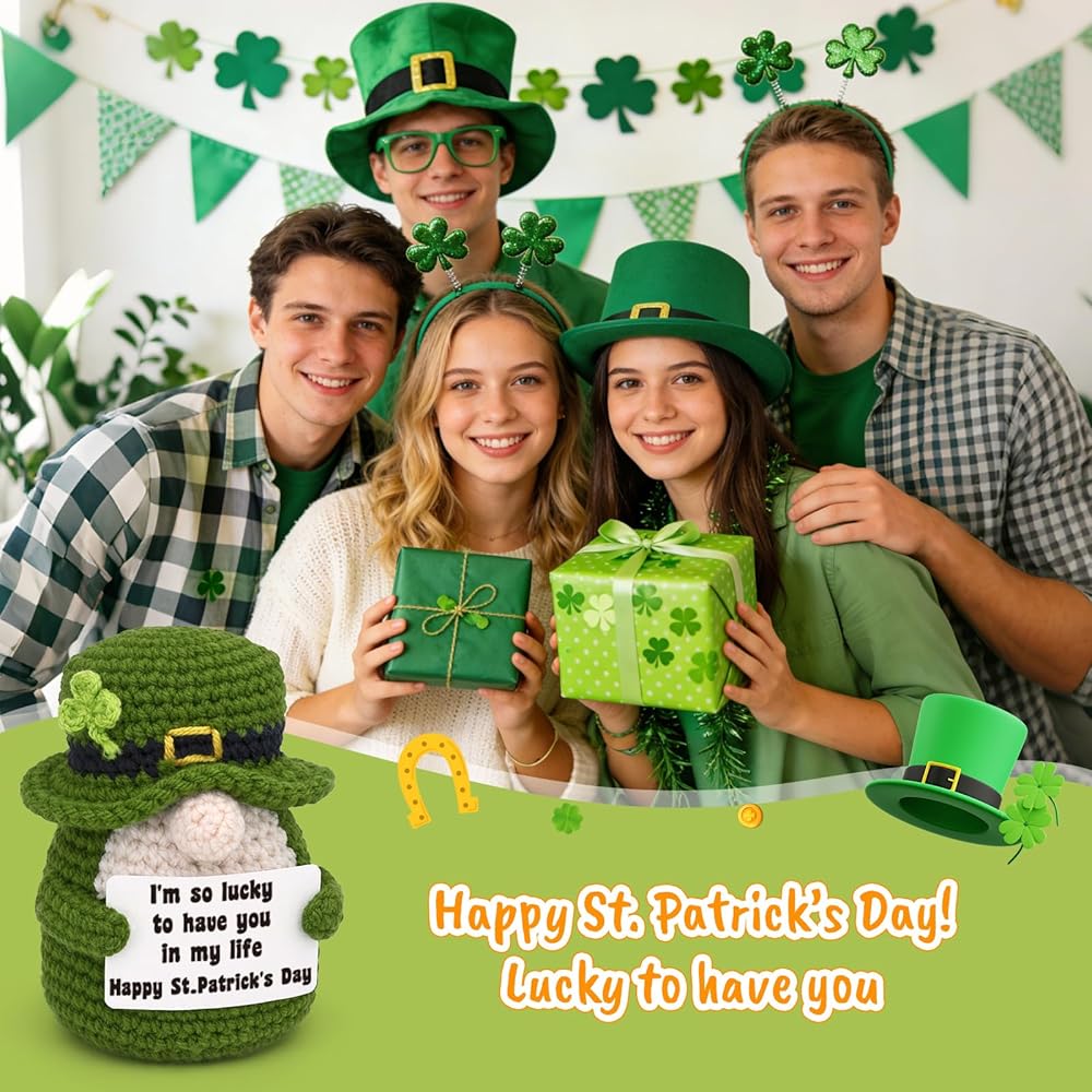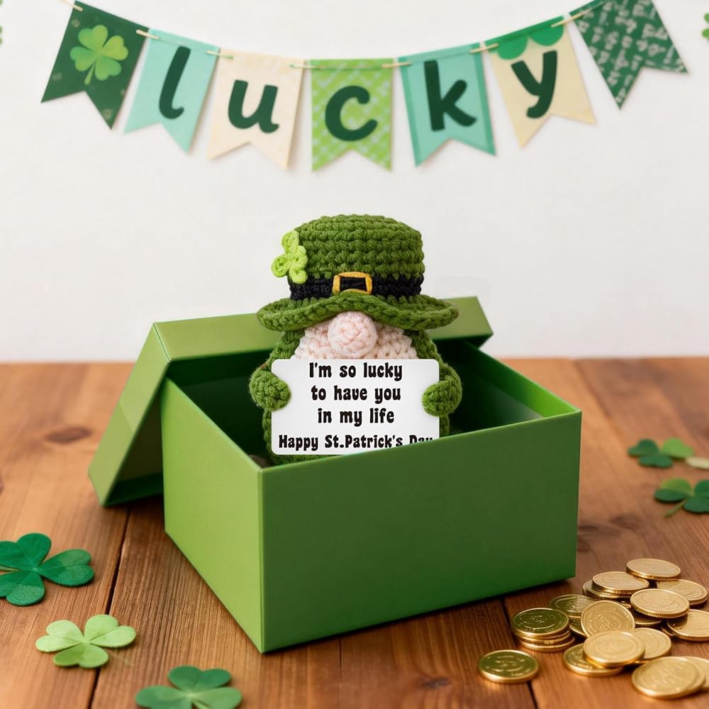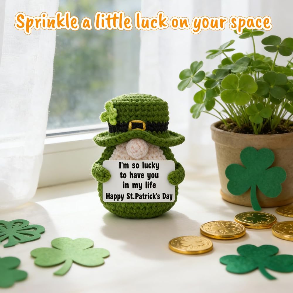Add a pinch of Irish luck and a whole lot of charm to your home this season! This handmade crochet leprechaun gnome is the perfect piece of St. Patrick's Day decor to brighten your space. The sweet, heartfelt card says it all: "I'm so lucky to have you in my life," making it a perfect small gift for a friend, family member, or partner. It is the ultimate addition to your farmhouse St. Patrick's Day tiered tray decor, instantly becoming the centerpiece of your display. It's also perfectly sized to be a cheerful shelf sitter on a mantel or in the kitchen. More than just a decoration, it's a lasting keepsake that can be treasured as part of your family's spring traditions year after year. Let this cute lucky charm gnome remind you of the special people who make your life feel so lucky.