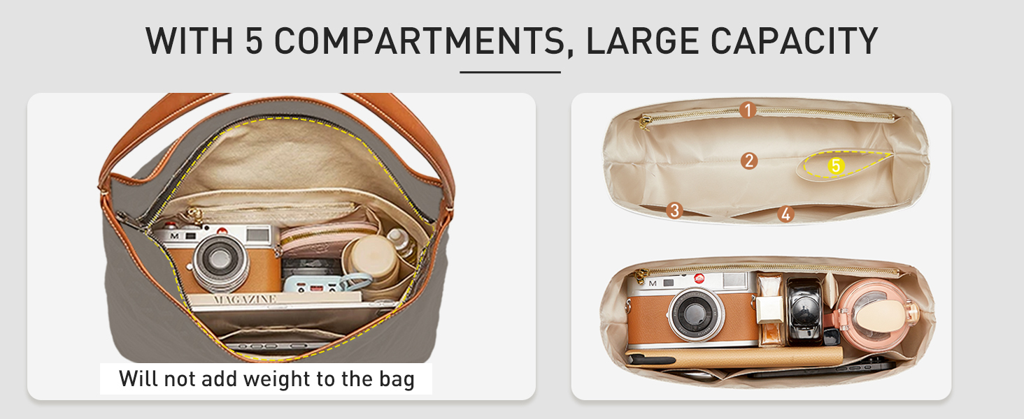 【تخطيط ذكي مكون من 4 أقسام】: يتميز بـ 4 مساحات عملية لتلبية احتياجات التخزين المتنوعة. يشتمل منظم حقيبة اليد هذا على جيبين مفتوحين (واحد كبير وواحد صغير) لسهولة الوصول إلى هاتفك، والنظارات الشمسية، وحقيبة المسحوق، والعطور وغيرها من الأشياء الصغيرة. جيب بسحاب لتخزين الأشياء الثمينة بشكل آمن مثل النقود وجوازات السفر. يمكن للحجرة الرئيسية حمل المجلات أو iPad أو السترات الخفيفة وغيرها من الأشياء الكبيرة، مما يحافظ على جميع متعلقاتك أنيقة وفي متناول اليد