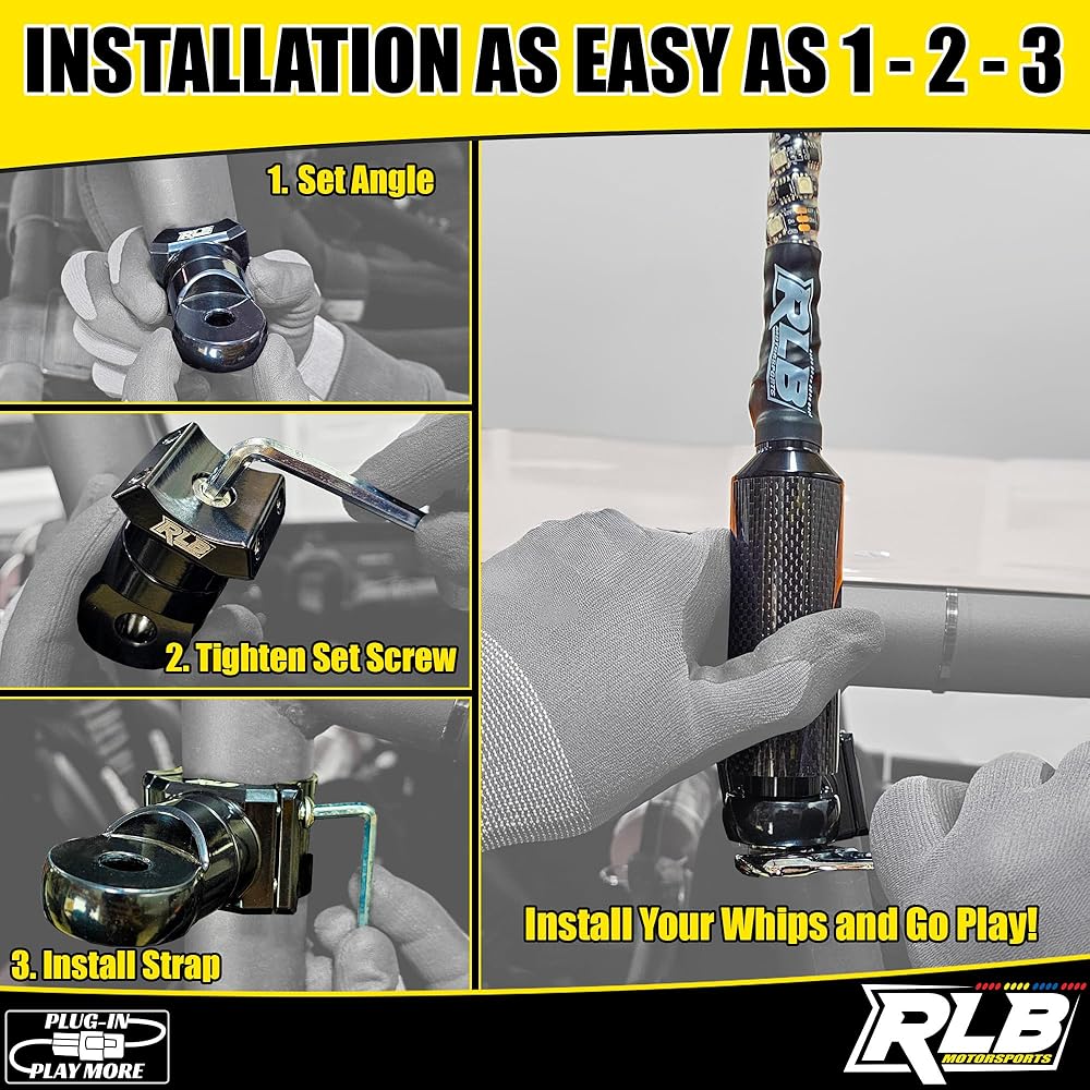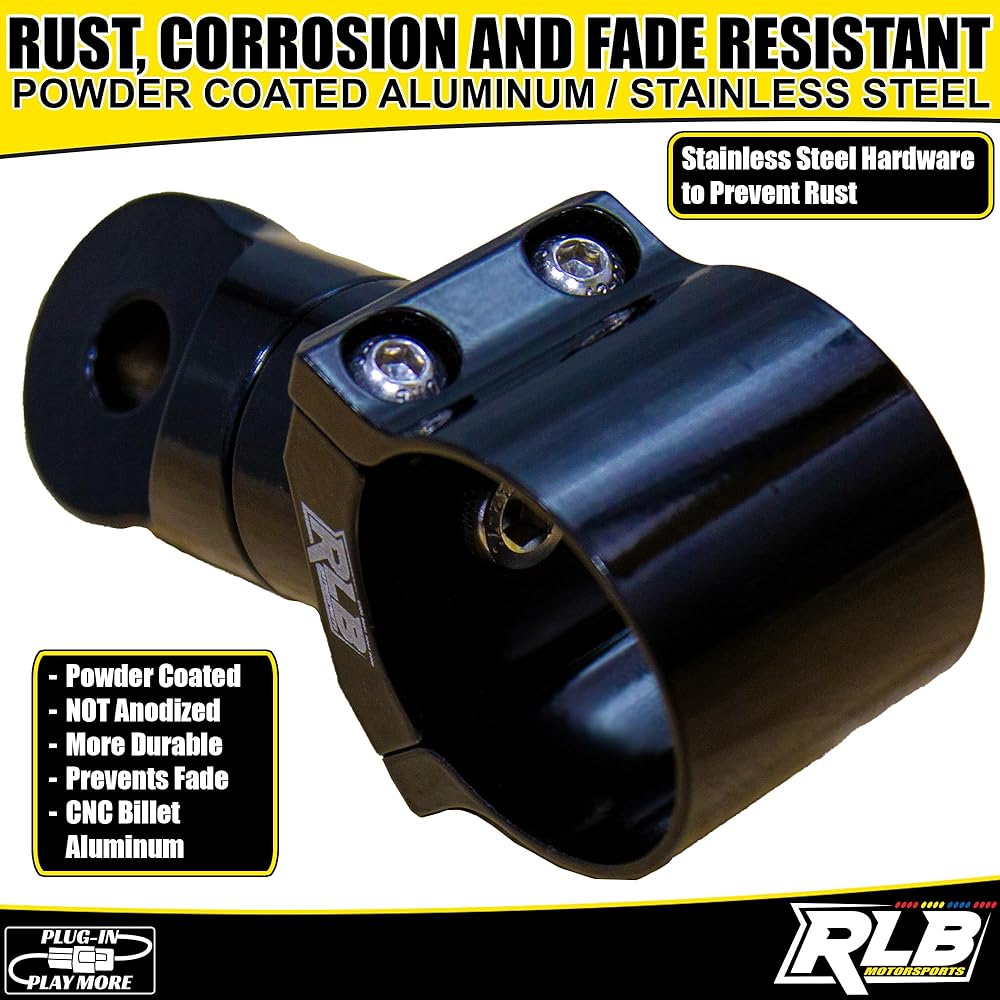 RLB Motorsports (1PC) 2" UTV whip mount are compatible with Honda Talon & Polaris RZR PRO R UTV, Off-road vehicles, including trucks, 4x4s, and Jeeps. It can be easily installed on any bar measuring 2". Compatible with any accessory that requires a .5″ mounting hole; whip lights, spot lights, radio antenna, flag pole, etc. These heavy-duty mounts utilize a unique 360° clockable micro-adjust rotation providing 10-degree increments and locks into position for a secure mount at any angle. Powder coated black for durability through all season weather and stainless-steel hardware for the tough sea water. Whips Mount capable of handling the tallest LED whips as you rip through the dunes. CNC machined solid billet aluminum for strength to hold the torque to your biggest flag!