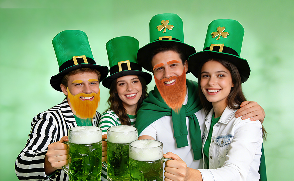 تصميم بمقاس واحد يناسب الجميع: مجموعة إكسسوارات عيد القديس باتريك تعتمد مقاسًا واحدًا يناسب جميع التصميمات، القبعة الخضراء مصممة لتناسب معظم أحجام الرأس بشكل مريح، مما يجعل قبعة الجني مناسبة للبالغين وكبار السن على حد سواء، بينما من السهل تعديل اللحية وارتداؤها.