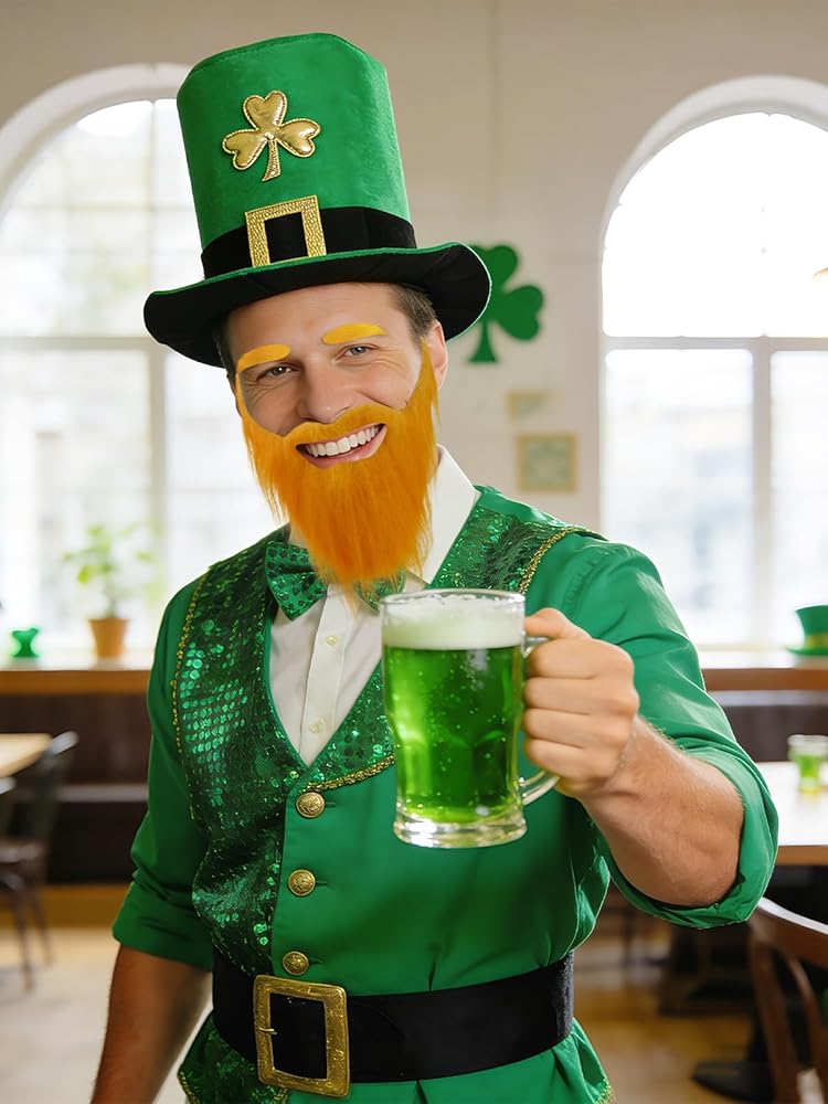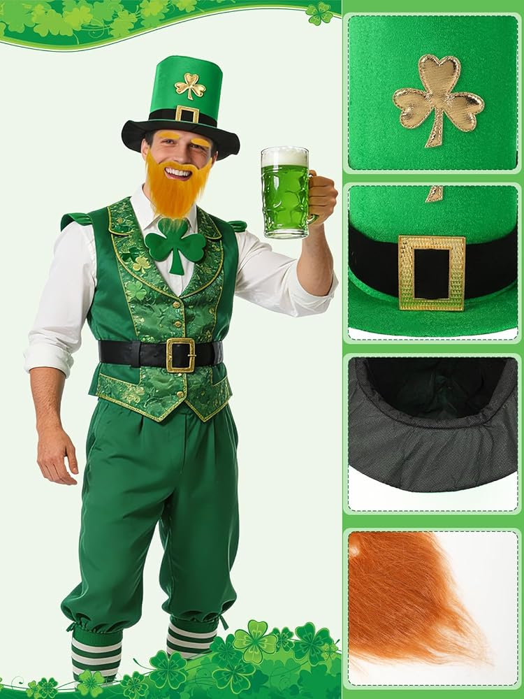 مجموعة أزياء Leprechaun كاملة مكونة من 4 قطع: تتضمن مجموعة ملحقات عيد القديس باتريك طرازين مختلفين من قبعة Leprechaun ولحيتين صناعيتين بظلال متنوعة من اللون الأخضر، زي Leprechaun يوفر مظهرًا متعدد الاستخدامات واحتفاليًا لأي احتفال