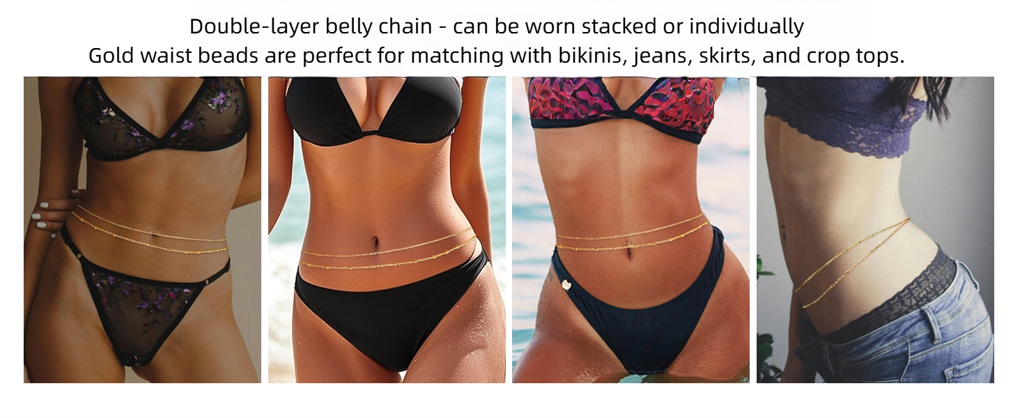 Diversified combinations: As an eye-catching accessory, a waist chain can instantly enhance the overall sense of layering and fashion when paired appropriately. It is suitable for bikinis, swimwear, crop tops, low-waisted pants, short tops, sports bras, jeans, wide-leg pants, hip-hugging skirts, camisole skirts, wrap skirts, chiffon skirts, dresses, etc.