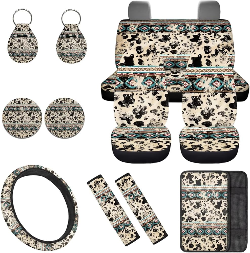 Personalized seat cushion covers, including 2 front seat cushion covers, 2 rear seat cushion covers, 1 steering wheel cover, 1 armrest cushion, 2 seat belt covers, 2 coasters, and 2 keychains, totaling 12 pieces