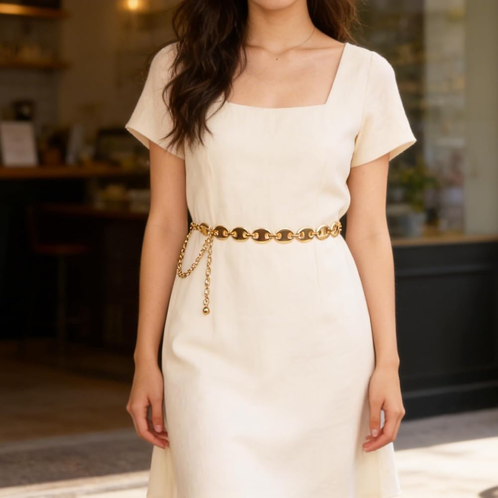 [سلسلة خصر ذهبية]: تتميز سلسلة حزام الخصر الكلاسيكية هذه بمظهر عصري ورقيق، والتي تتضمن حلقات دائرية بيضاوية بتصميم فتحات صغيرة. سلسلة الحزام العصرية يمكن أن تتماشى مع أنماط مختلفة من الملابس، كديكور لملابسك، سلسلة الخصر هذه ستعزز إحساس فستانك، وتضيف مظهرًا براقًا وأنيقًا إلى ملابسك.