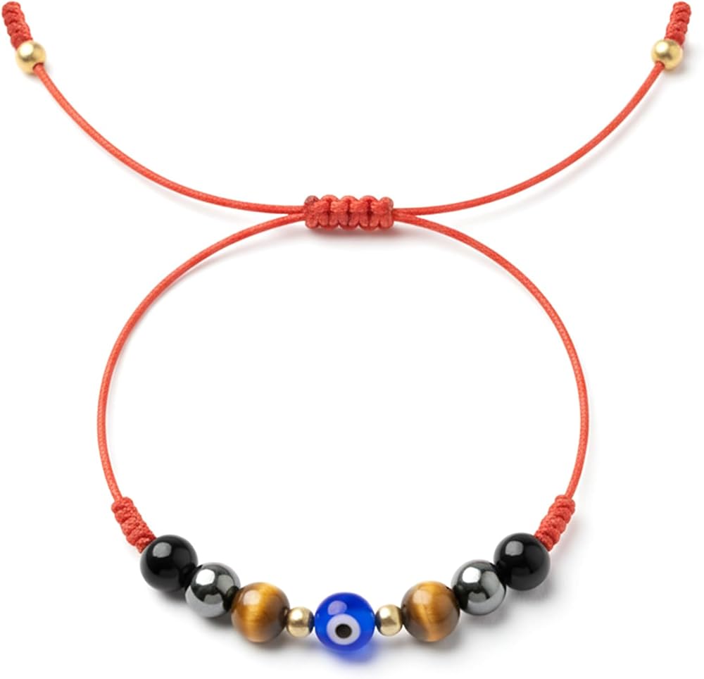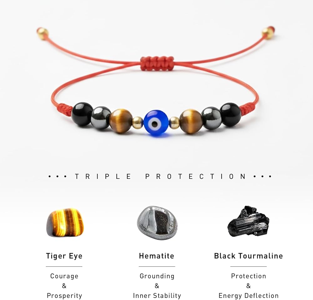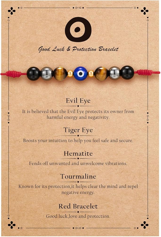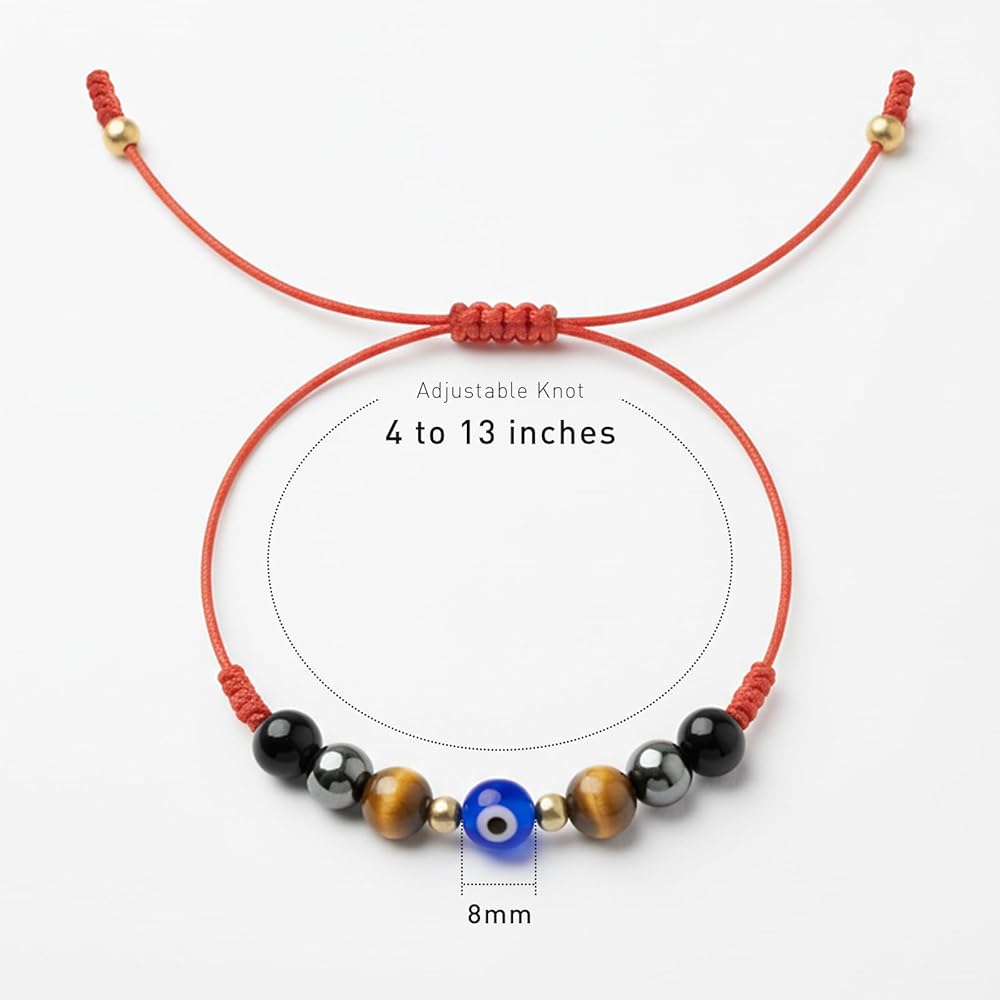 • المادة والحجم - هذا السوار الكريستالي مصنوع من خرزات 8 مم من عين النمر والتورمالين الأسود والهيماتيت والعين الشريرة، جميعها مربوطة بخيط أحمر - رمز الحظ السعيد والحب والحماية. يحتفظ كل حجر بملمسه الطبيعي للحفاظ على خصائصه الحيوية. السوار قابل للتعديل ويمكن أن يمتد إلى أقصى طول 13 بوصة.