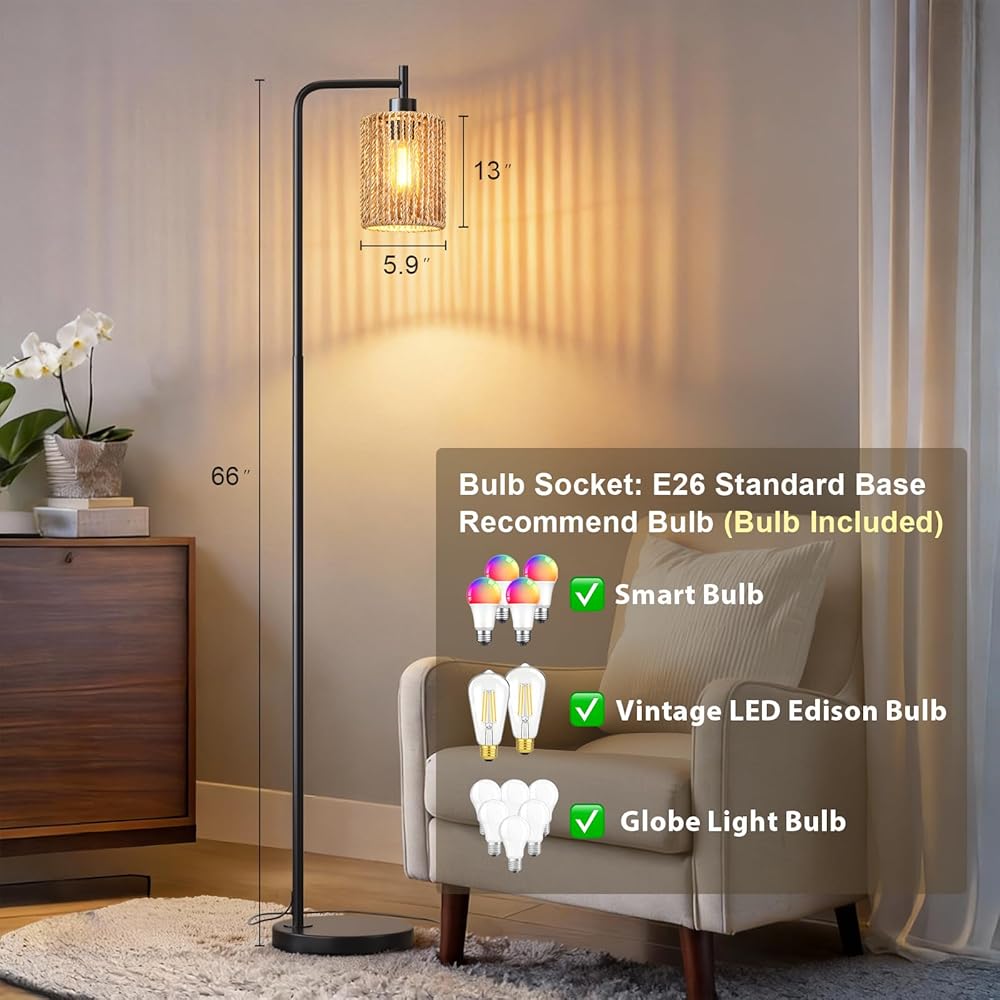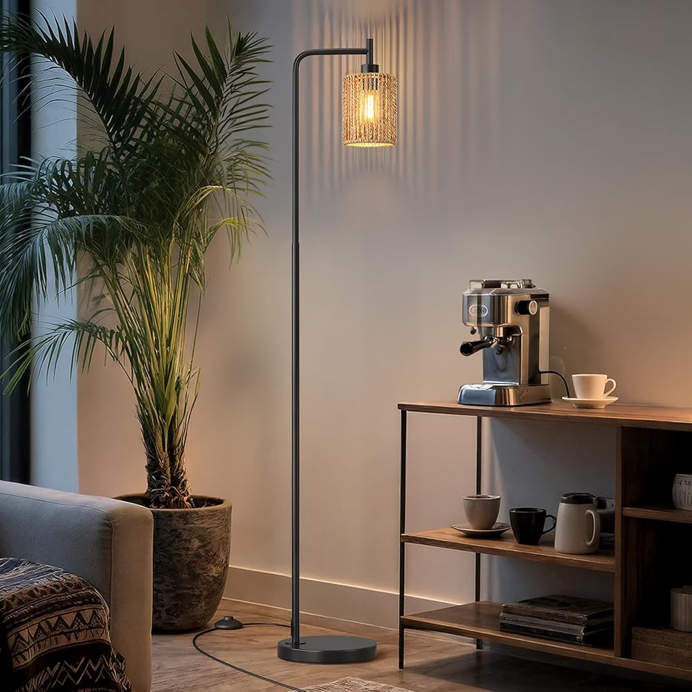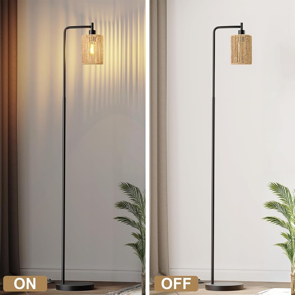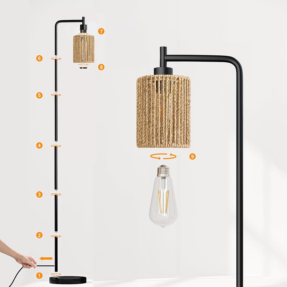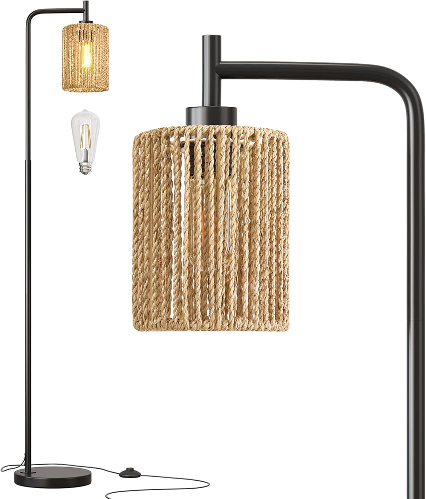 مصباح أرضي أسود مقاس 66 بوصة من Oneach لغرفة المعيشة، مصباح أرضي بوهو مع لمبة LED، ظل الروطان، مفتاح القدم، مصباح صناعي طويل القامة لغرفة النوم، غرفة الطعام، غرفة الدراسة، المكتب