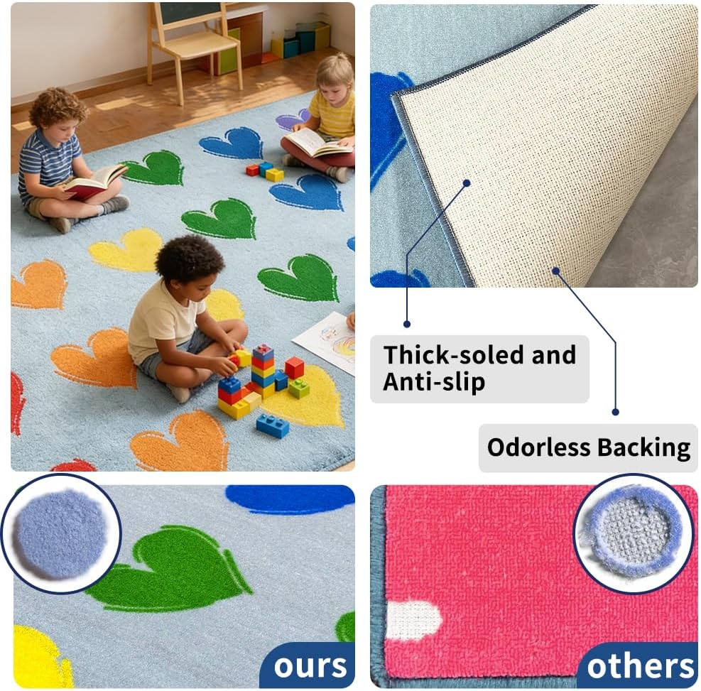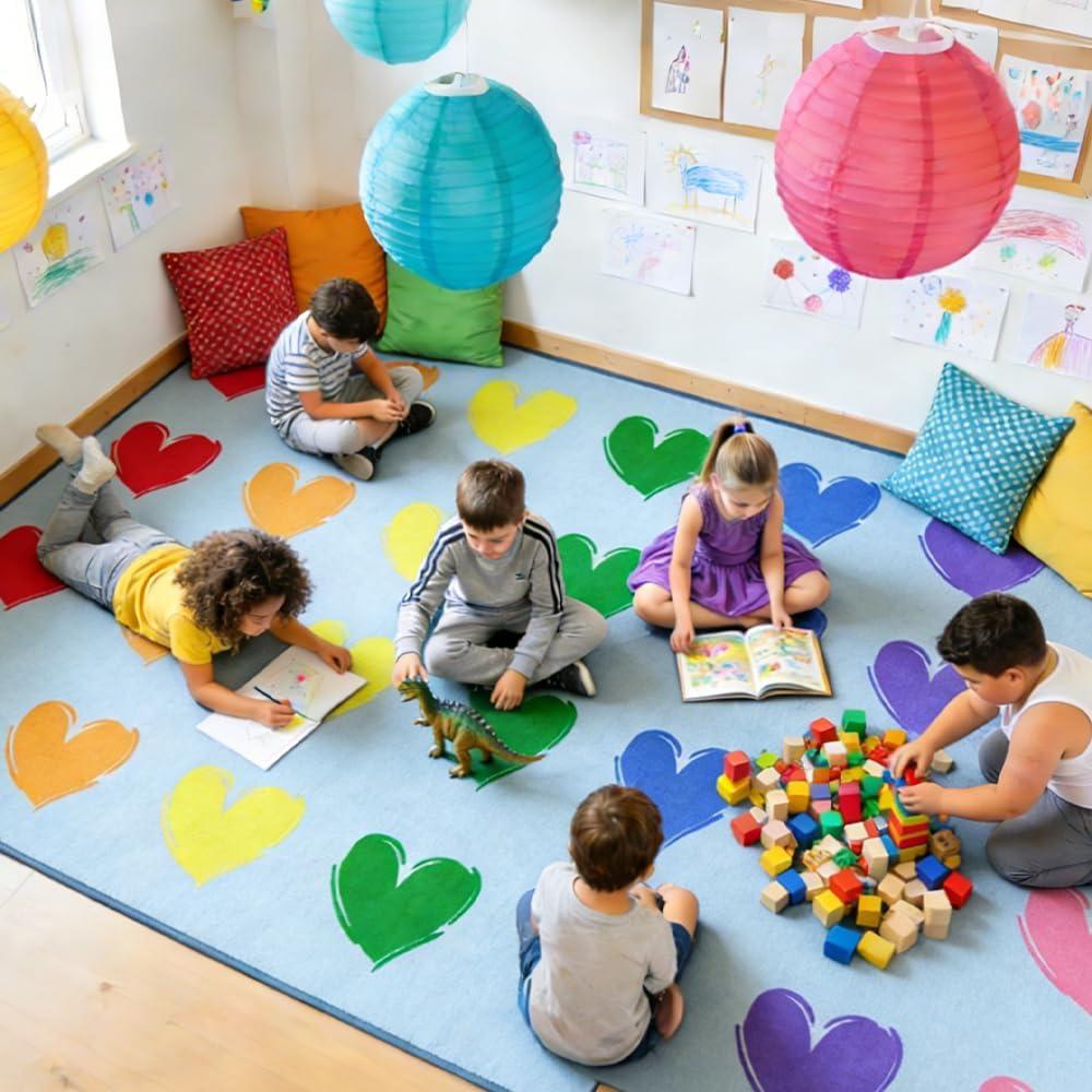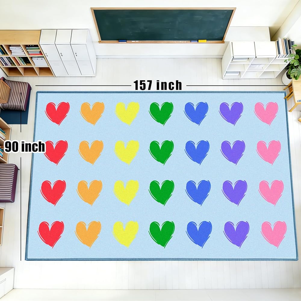 سجادة الفصل الدراسي الكبيرة: 7'7 بوصة × 13'1 بوصة سجادة الفصل الدراسي الزرقاء تتسع لما يصل إلى 28 طفلاً. تتميز سجادة الفصل الدراسي الابتدائية هذه بتصميم فريد يتميز بقلب ملون، مما يجعلها مثالية لألعاب التدريس التفاعلية مع الطلاب.
