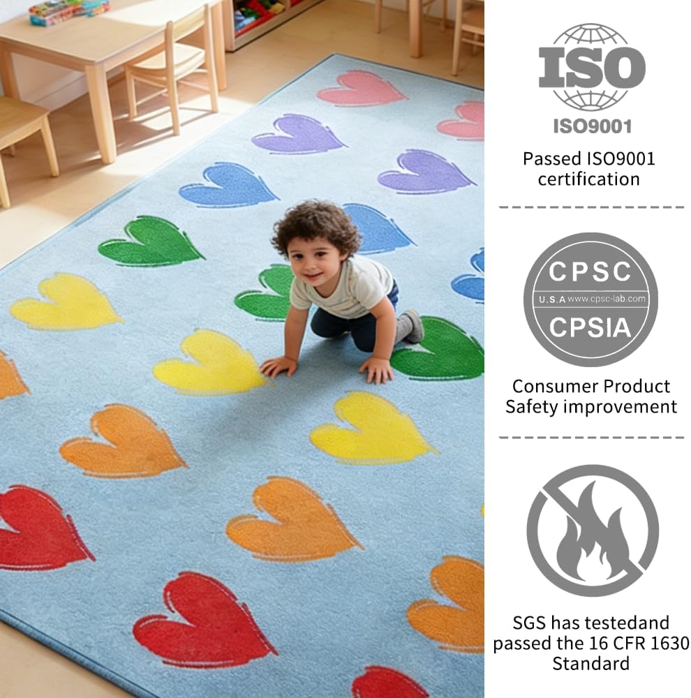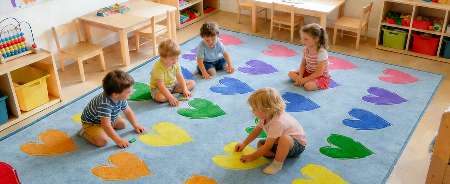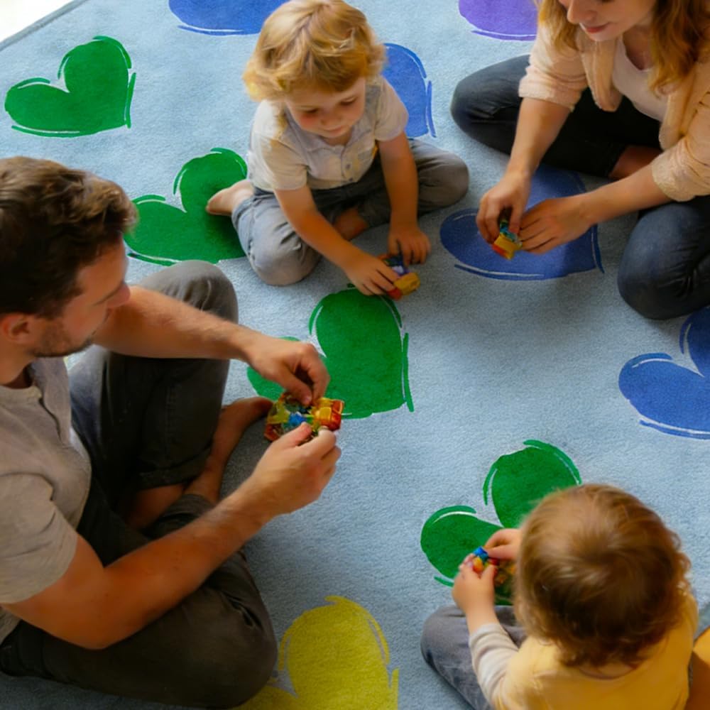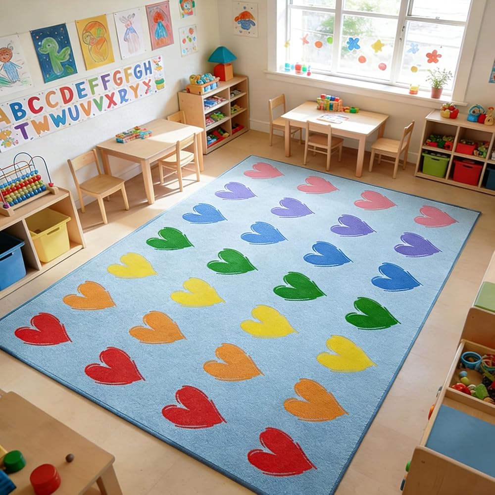 سجادة الفصل الدراسي الكبيرة: 7'7 بوصة × 13'1 بوصة سجادة الفصل الدراسي الزرقاء تتسع لما يصل إلى 28 طفلاً. تتميز سجادة الفصل الدراسي الابتدائية هذه بتصميم فريد يتميز بقلب ملون، مما يجعلها مثالية لألعاب التدريس التفاعلية مع الطلاب.