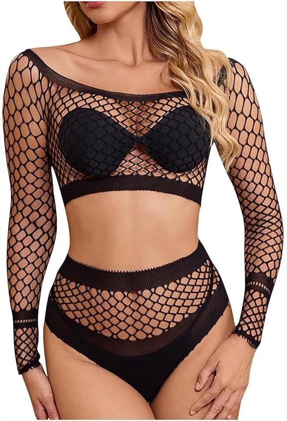 Occasions :When it comes to parties, nightclubs, or any social event where you want to be the center of attention, this red fishnet set is your go-to. The long-sleeve crop top and high-waisted bottom balance boldness and elegance. Under the glow of party lights, the red mesh shimmers, and the see-through design ensures you'll turn heads whether you're dancing or mingling.