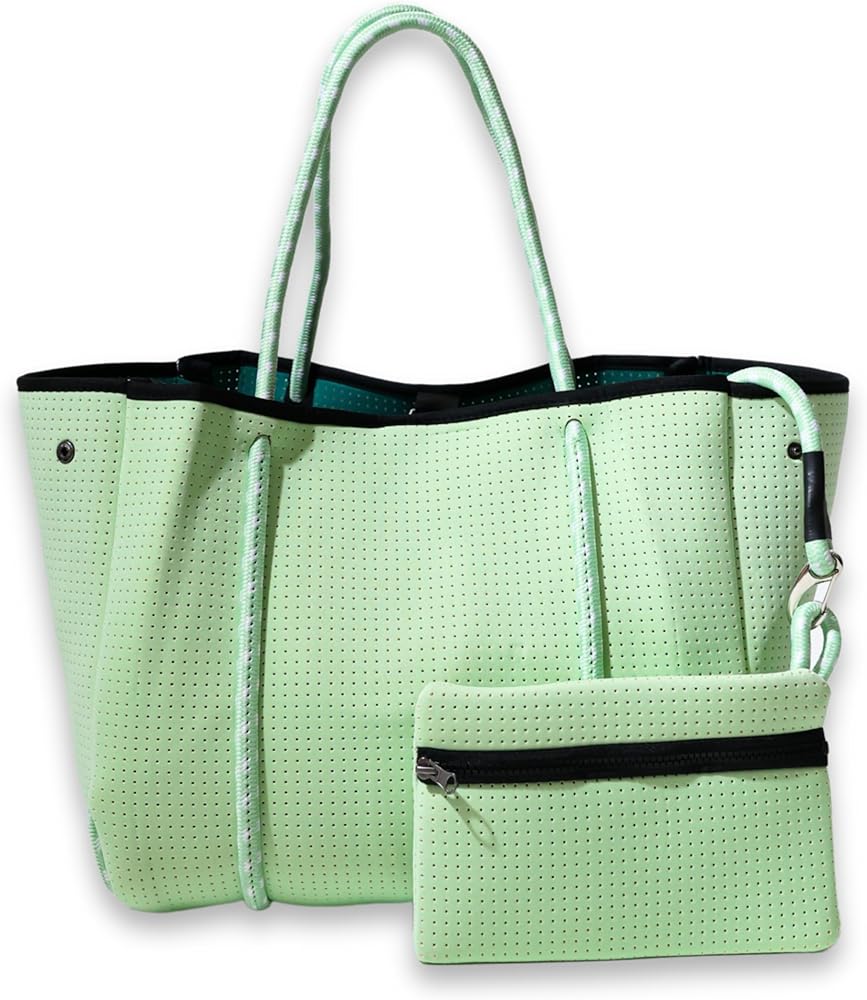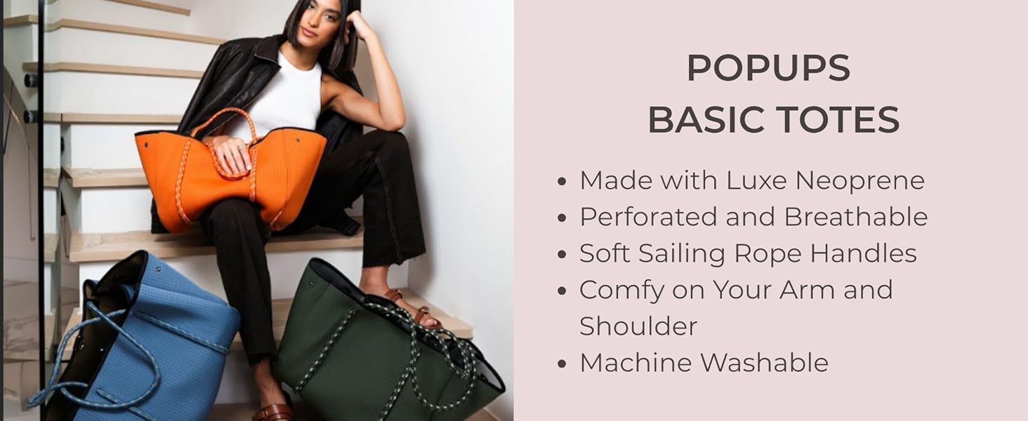 Elevate your everyday style with the POPUPS Large Neoprene Tote Bag , perfect fusion of sophistication, functionality, and versatility. Whether you need a stylish beach tote for women, a functional mom bag, or a trendy carry-on tote for travel, this bag has you covered. Crafted from 100% luxe perforated neoprene fabric, this durable tote bag offers water resistance and breathability, making it ideal for any adventure—from the office to a weekend getaway. Its oversized yet lightweight design provides ample space for essentials like your laptop, gym gear, or art supplies while remaining compact enough to serve as a cute everyday tote bag. This standout tote is a stylish statement piece available in an array of colors to discover. Thoughtful details, including a detachable zippered pouch, adjustable pockets, side buttons, and a removable insert for added structure, ensure this tote adapts to your needs—whether you're packing an overnight bag or looking for the perfect teacher gifts. Easy to maintain, this neoprene bag is machine washable in cold water and air-dries flat in no time, making it a convenient option for daily use. It's perfect for anyone looking for a functional yet fashionable tote that can change from commuter tote to pool bag in a flash. Experience POPUPS—where stylish totes meet practicality. Perfect for women who balance family, work, fun and everything in between.