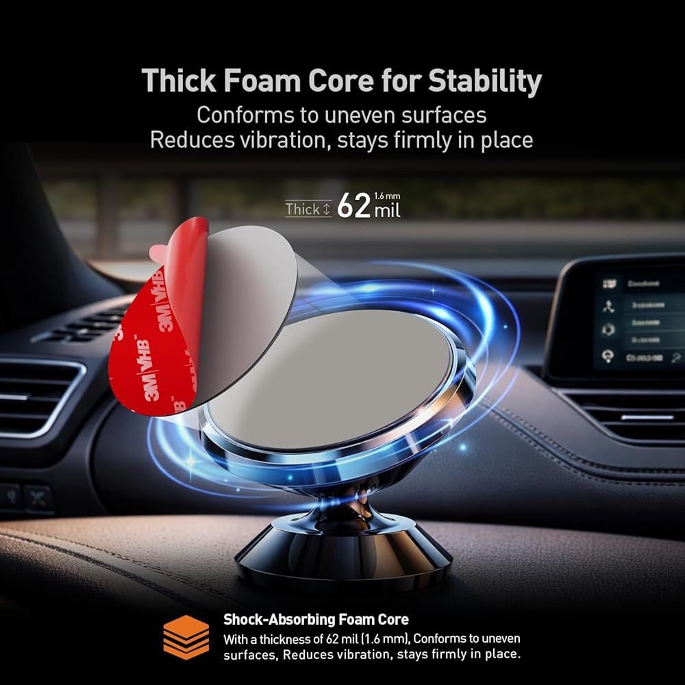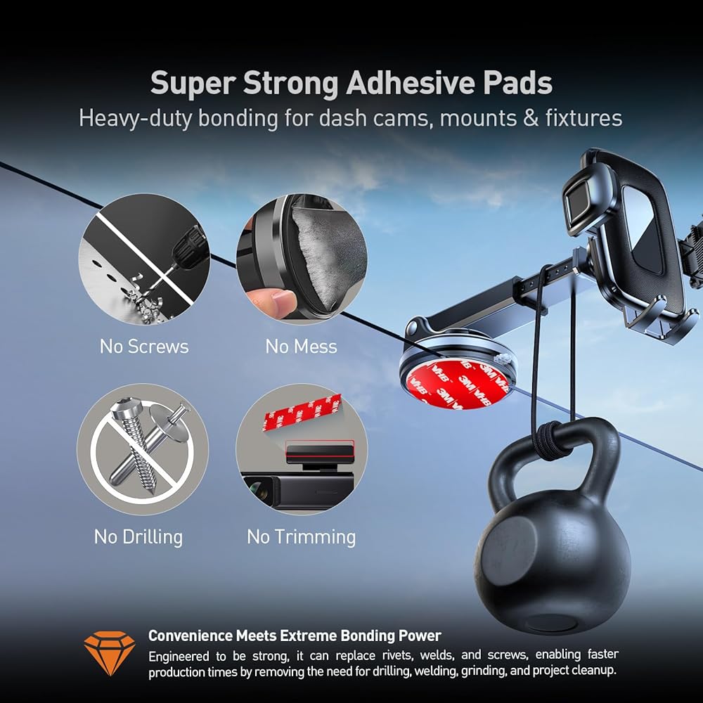 STRONG ADHESION: Featuring premium VHB GPH-160 foam tape, these pads deliver super strong, permanent adhesion to smooth surfaces like glass, metal, tile, wood, and plastic. They are the ideal, exceptionally durable solution for mounting dash cams, GPS units, and phone holders, effectively replacing unreliable suction cups. Engineered for ultimate resilience, the adhesive holds firm and won't fail, even when subjected to harsh conditions like the extreme heat of an Arizona summer or continuously heated car windshields.