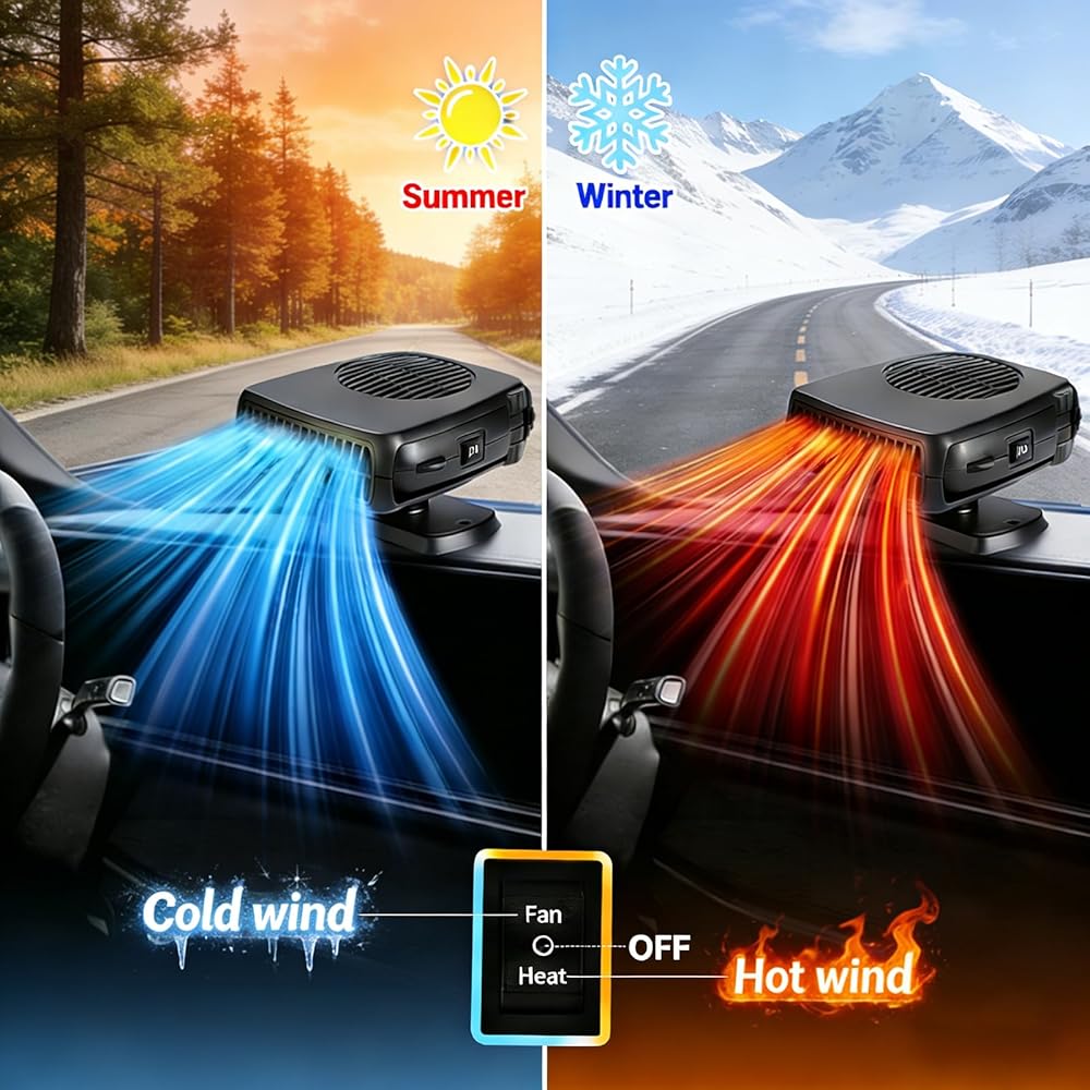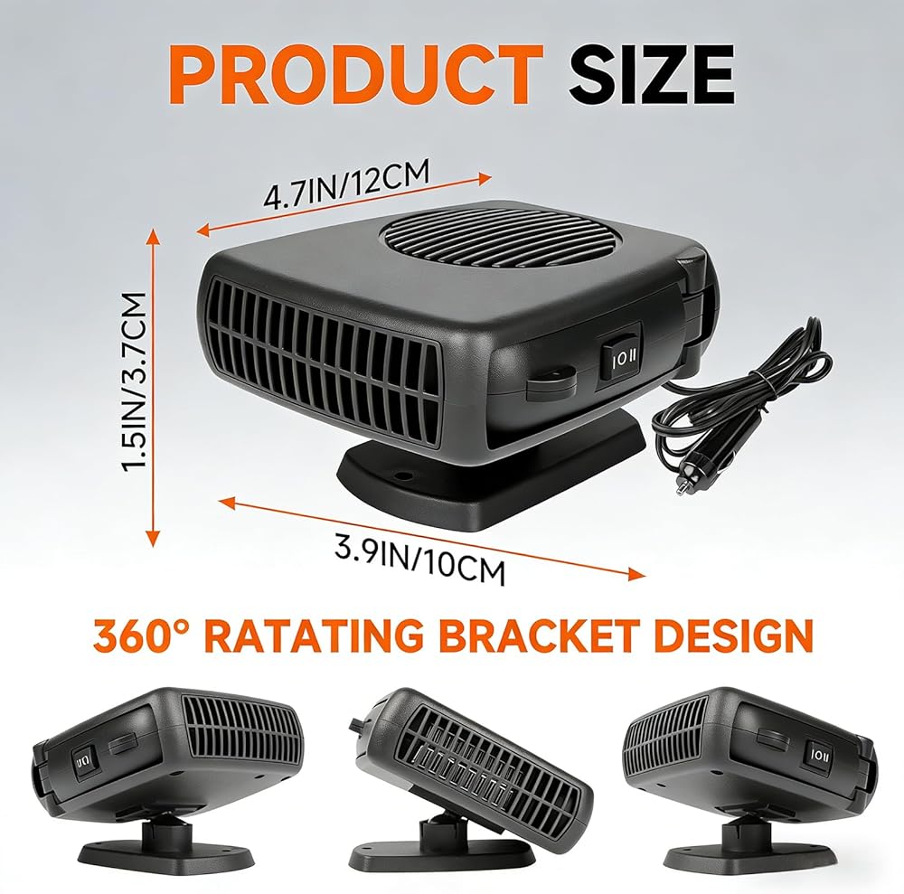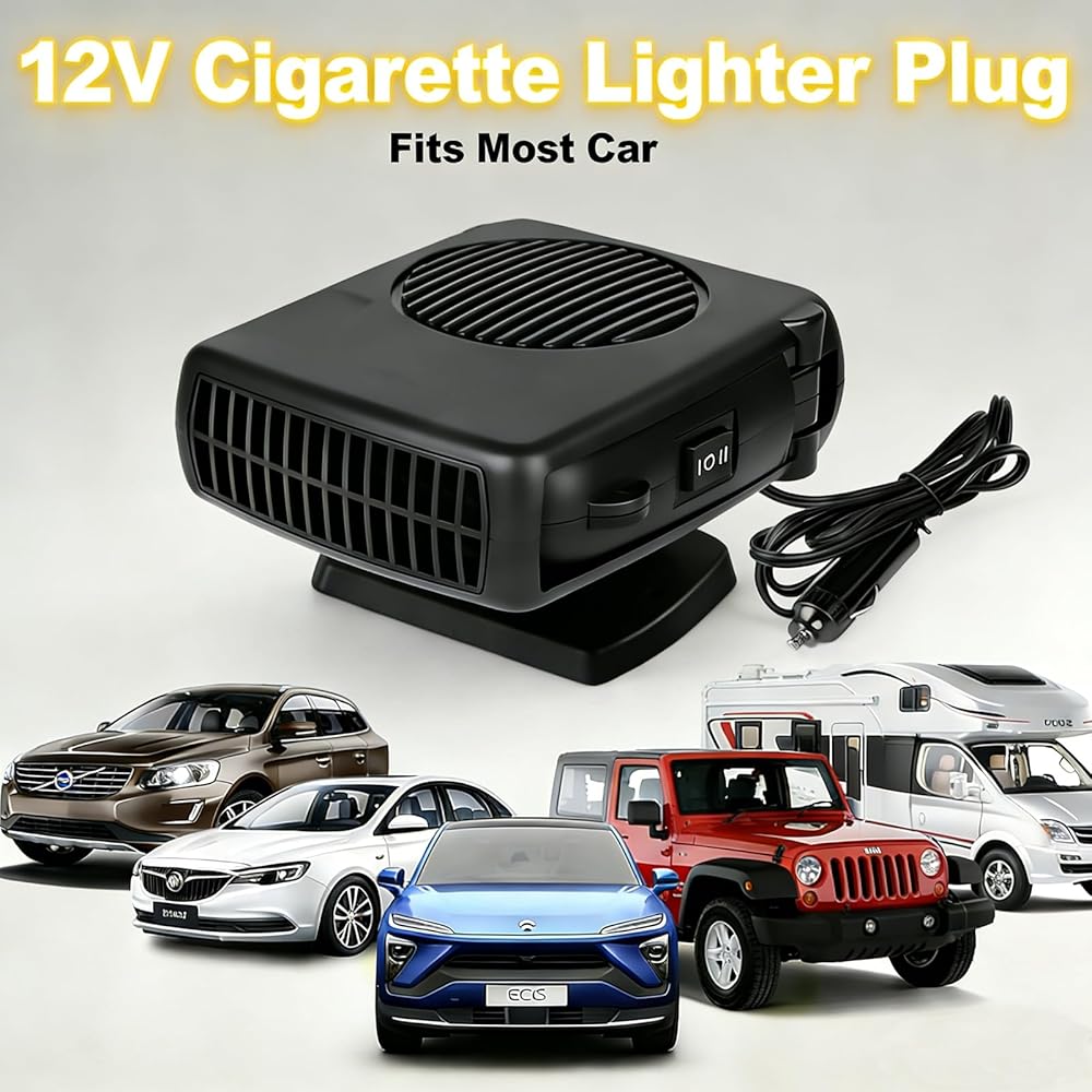 Bring comfort, clarity and confidence to every drive with POYICGS. Imagine starting your morning ride, stepping into your vehicle and feeling an immediate inviting warmth—no waiting, no fogged windshield, no frustration. Our portable car heater plugs directly into your 12 V cigarette lighter socket and transforms your cabin into a cozy, safe zone. Whether you're parked overnight in the cold, struggling with a frosted windshield or simply want a refreshing breeze during warmer weather, this all‑in‑one heater for car use has you covered. With dual‑function modes—heat and ventilation—you can quickly switch from demisting the glass to circulating air throughout your cabin. The 360° rotating bracket lets you aim warm air exactly where you need it—towards your feet, the defrost line or across both seats. Built from premium ABS and high‑density heat‑resistant plastics, the POYICGS portable car heater is crafted for durable, reliable performance. Inside, a high‑quality anti‑oxidant alloy heating element and automatic power‑off protection chip safeguard your vehicle's electrical system while delivering the warmth or airflow you expect. And because it's whisper‑quiet, you'll hear nothing but the road and your favorite playlist—no distracting buzzing or fan noise. From compact cars to trucks, SUVs, RVs and UTVs, this plug‑in car heater fits seamlessly into any 12 V vehicle with a cigarette lighter socket. It leaps into action in seconds and works hard to clear your windshield, demist side windows or keep the interior comfortable—even in the coldest weather. When travel means unpredictable conditions, this car space heater becomes your dependable companion. At POYICGS, we believe your journey should feel warm, safe and effortless. If you ever have questions or need support, our dedicated customer care team is ready to help. Slide the plug in, feel the comfort, and hit the road with confidence.
