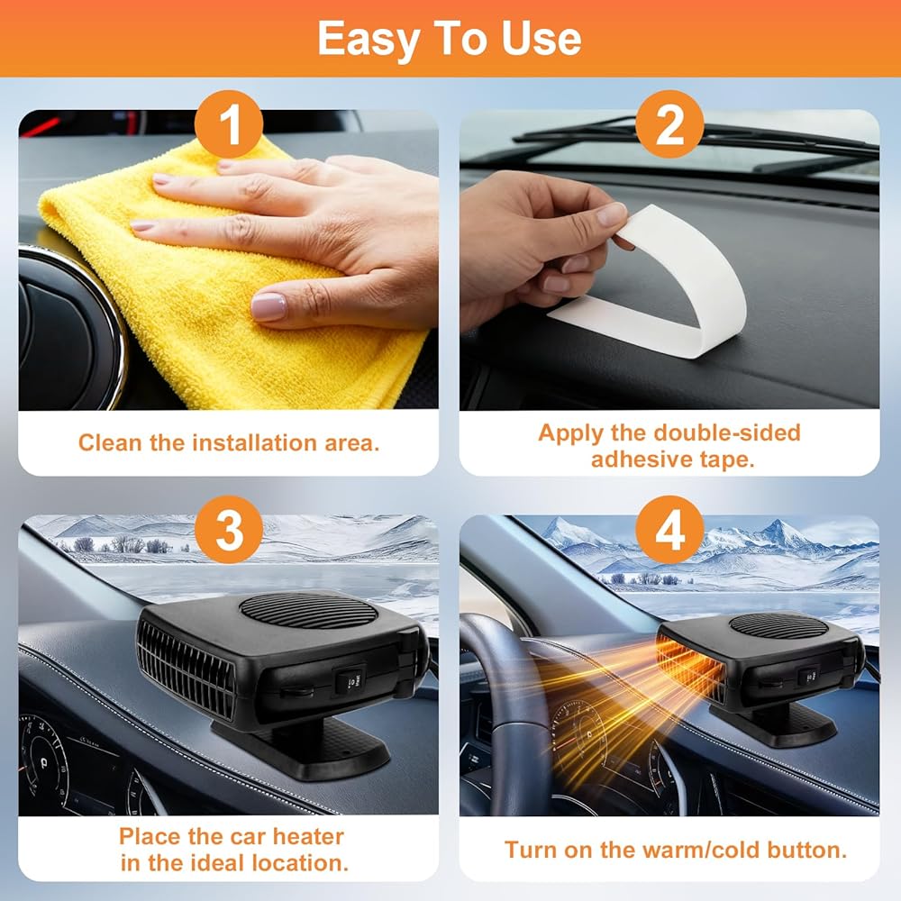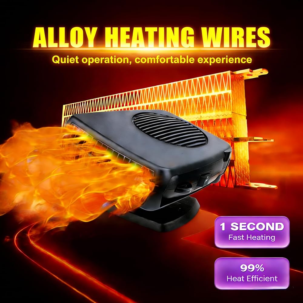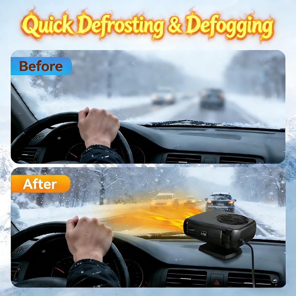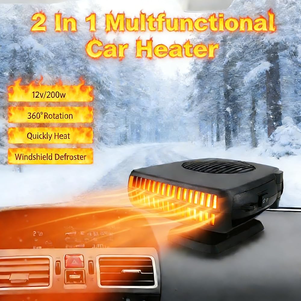 Bring comfort, clarity and confidence to every drive with POYICGS. Imagine starting your morning ride, stepping into your vehicle and feeling an immediate inviting warmth—no waiting, no fogged windshield, no frustration. Our portable car heater plugs directly into your 12 V cigarette lighter socket and transforms your cabin into a cozy, safe zone. Whether you're parked overnight in the cold, struggling with a frosted windshield or simply want a refreshing breeze during warmer weather, this all‑in‑one heater for car use has you covered. With dual‑function modes—heat and ventilation—you can quickly switch from demisting the glass to circulating air throughout your cabin. The 360° rotating bracket lets you aim warm air exactly where you need it—towards your feet, the defrost line or across both seats. Built from premium ABS and high‑density heat‑resistant plastics, the POYICGS portable car heater is crafted for durable, reliable performance. Inside, a high‑quality anti‑oxidant alloy heating element and automatic power‑off protection chip safeguard your vehicle's electrical system while delivering the warmth or airflow you expect. And because it's whisper‑quiet, you'll hear nothing but the road and your favorite playlist—no distracting buzzing or fan noise. From compact cars to trucks, SUVs, RVs and UTVs, this plug‑in car heater fits seamlessly into any 12 V vehicle with a cigarette lighter socket. It leaps into action in seconds and works hard to clear your windshield, demist side windows or keep the interior comfortable—even in the coldest weather. When travel means unpredictable conditions, this car space heater becomes your dependable companion. At POYICGS, we believe your journey should feel warm, safe and effortless. If you ever have questions or need support, our dedicated customer care team is ready to help. Slide the plug in, feel the comfort, and hit the road with confidence.