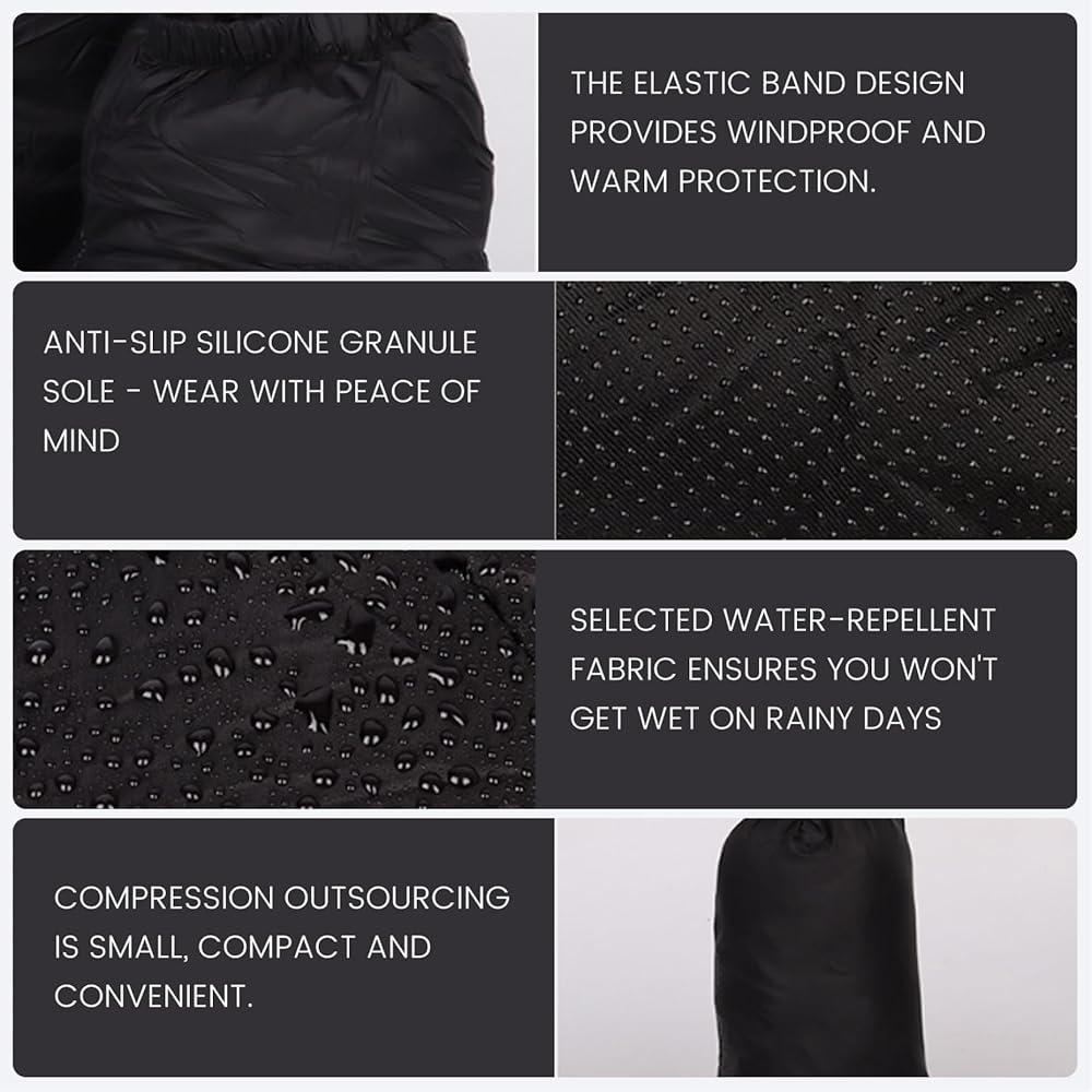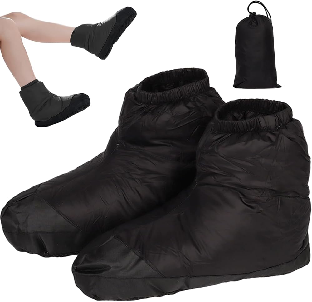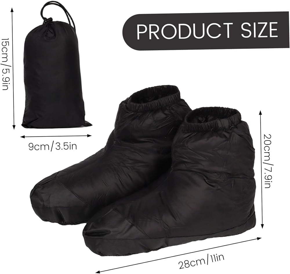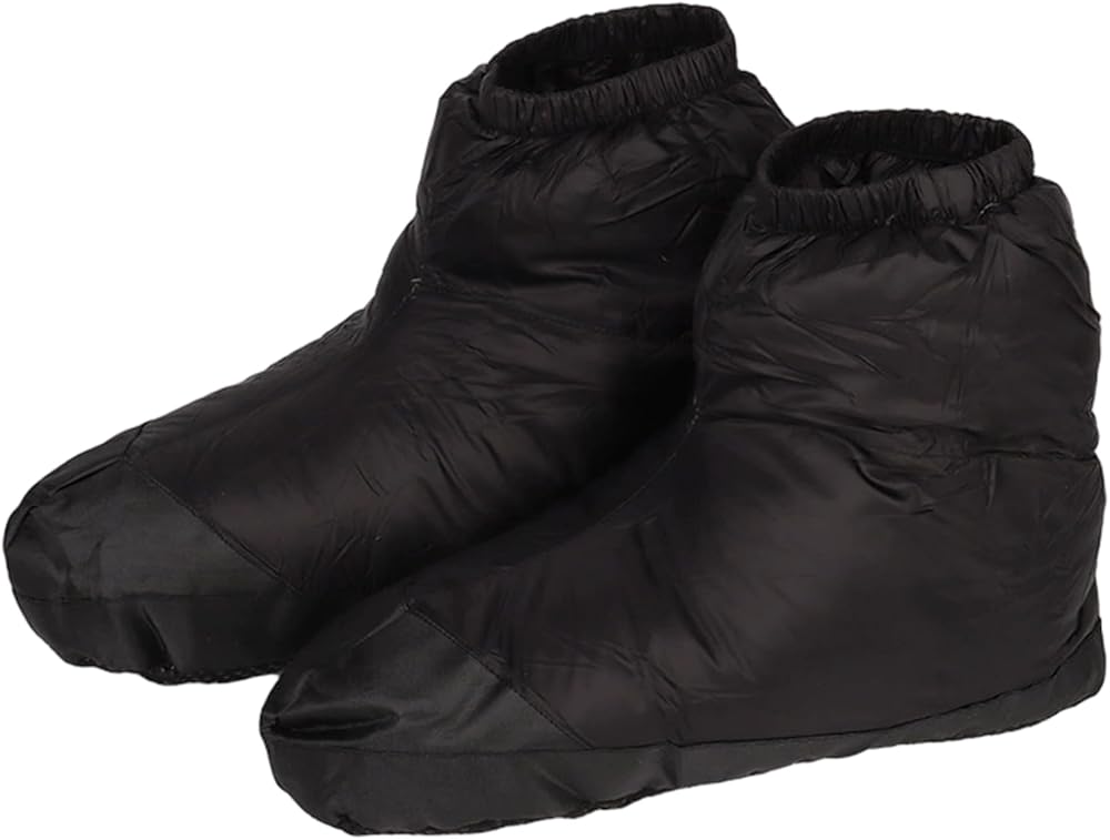 Stay warm and comfortable in any environment with these Down Booties for women and men. Filled with plush down and lined with soft fabric, they provide exceptional warmth and cushioning for your feet. The lightweight nylon construction allows for easy movement while keeping feet insulated during cold weather activities such as camping, hiking, or lounging indoors. Waterproof and windproof properties ensure your feet remain dry and protected, even in damp or windy conditions. The non-slip sole provides secure footing on a variety of surfaces, enhancing safety both indoors and outdoors. Designed for versatility, these booties are suitable for all genders and are ideal as travel, camping, or winter footwear. Combining comfort, warmth, and lightweight portability, these down booties are a practical and stylish solution for keeping your feet cozy in any cold-weather scenario.