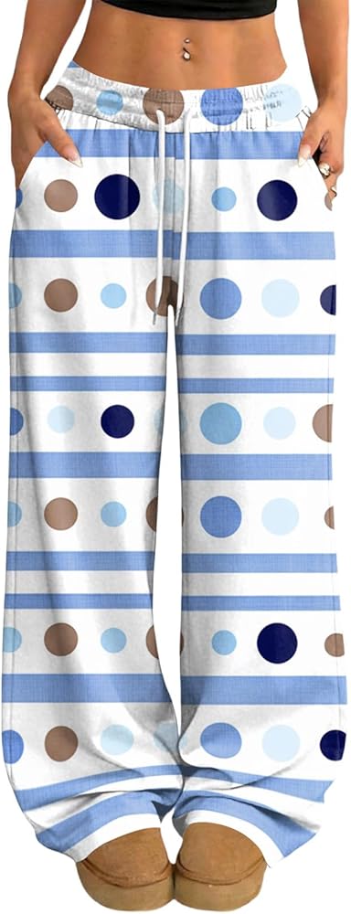Women's High Waisted Fashion Pattern Wide Leg Sweatpants Drawstring Baggy Lounge Workout Joggers with Pockets in Kuwait