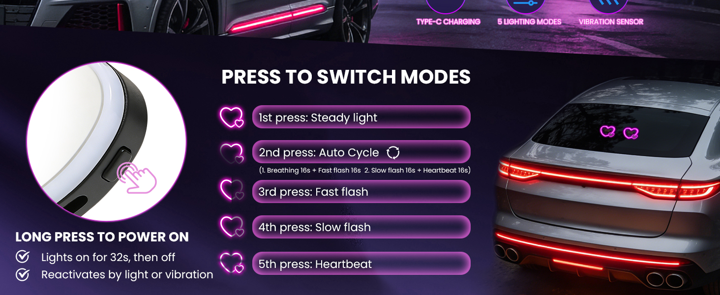 💫(طريقتان للاستشعار): يضيء ضوء القلب LED للسيارة تلقائيًا عندما يستشعر الضوء المحيط الخافت أو الاهتزازات، مثل بدء تشغيل السيارة، أو النقر بلطف على النافذة، أو إغلاق الباب. ملاحظة: عندما لا يكون هناك اهتزاز أو يكون الضوء ساطعًا جدًا، سيدخل الضوء تلقائيًا في وضع توفير الطاقة ويظل مغلقًا