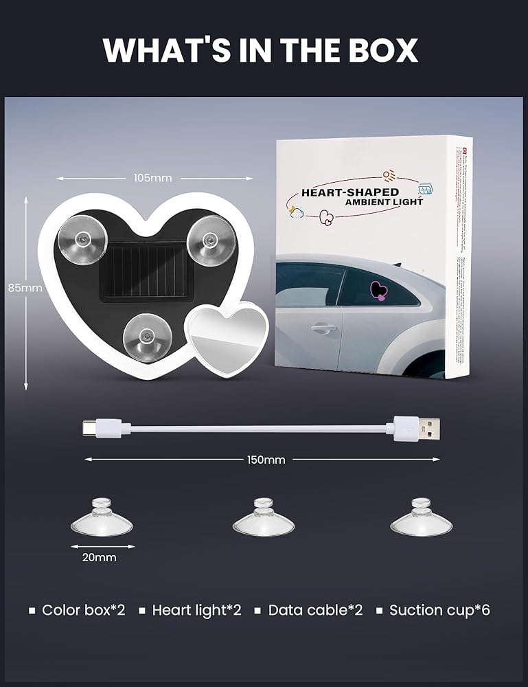 🌞【طريقتان للشحن】: تم تجهيز مصباح LED على شكل قلب للسيارة بلوحة شمسية عالية الكفاءة في التحويل وبطارية 300 مللي أمبير في الساعة، تدعم الشحن من النوع C. يوفر الشحن لمدة ساعتين 8-10 ساعات من الاستخدام، مما يسمح لك بالاستمتاع بالأجواء الرومانسية حتى في الأيام الغائمة أو الممطرة. يرجى شحن المنتج بالكامل قبل الاستخدام الأول