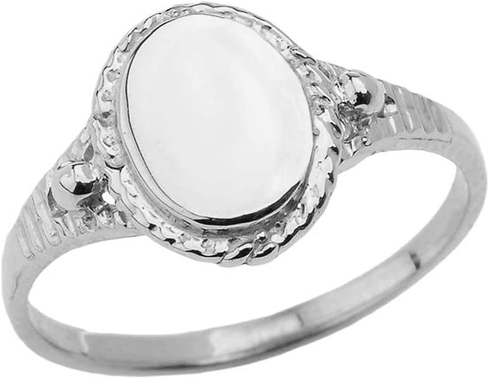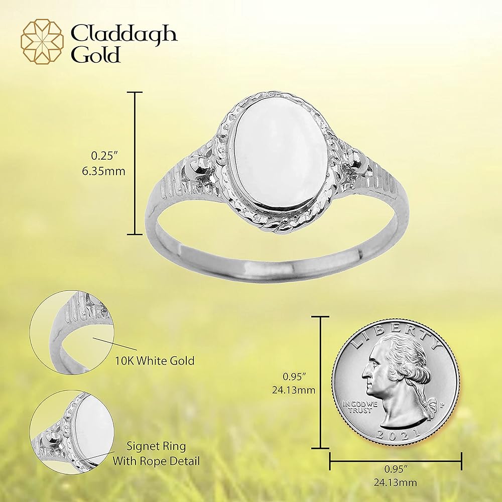 A SIGNET RING OF NOTE - Claddagh Gold presents this elegant engravable 925 sterling silver oval-shaped signet ring. The face of the ring has a smooth polished surface that's ready to be engraved with your initials or a design of your choice. The flat oval surface is offset by a milgrain rope style border. The ring has a tapered comfort style band with horizontal fluting. This exceptional, comfortable signet ring is a fashionable look for women that denotes pride in one's familial or club bonds.
