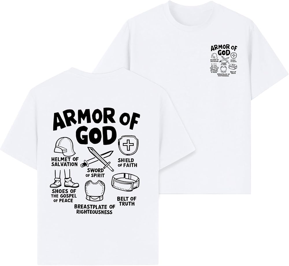 • المزايا: تصميم كلاسيكي برقبة دائرية، وأكمام قصيرة، وطباعة حروف "Armor of God". هدايا مسيحية للأولاد، قمصان مسيحية للأطفال، قمصان آية الكتاب المقدس للأطفال، قمصان يسوع للأطفال