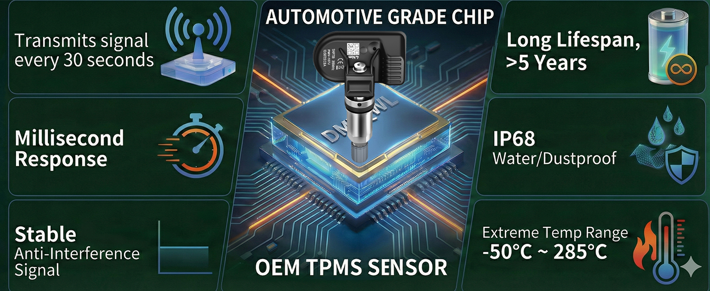 🔧[PRE-PROGRAMMED]: Factory pre-programmed – NO coding or extra fees; | 30-minute install with TPMS scan tool; | Maintains optimal tire pressure to reduce rolling resistance; | Helps improve fuel efficiency and extend tire life.