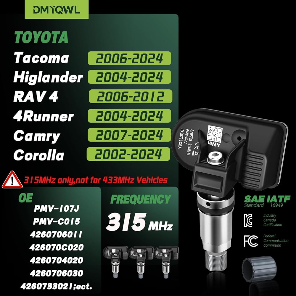 ✅ [PREMIUM-GRADE TPMS]: ① Frequency: 315 MHz,not 433 MHz; ②Chip: Dual-Axis High-Precision Automotive SNP Chip; ③ Battery: Stable Voltage cells,≥ 5 Years Lifespan; ④ Valve Material: Aluminium Alloy; ⑤ Certification: IC/FCC/CE/IP67 Certification; ⑥ Operating Range: -40℃+125℃; ⑦ Pressure Monitoring: 0-900KPa.