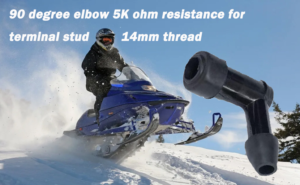رقم القطعة: LB05F، مقاومة الكوع 90 درجة 5K أوم للخيط الطرفي. 14 مم. أغطية المقاوم مخصصة لتطبيقات الدراجات النارية والبحرية وعربات الثلوج والمحركات الصغيرة فقط.