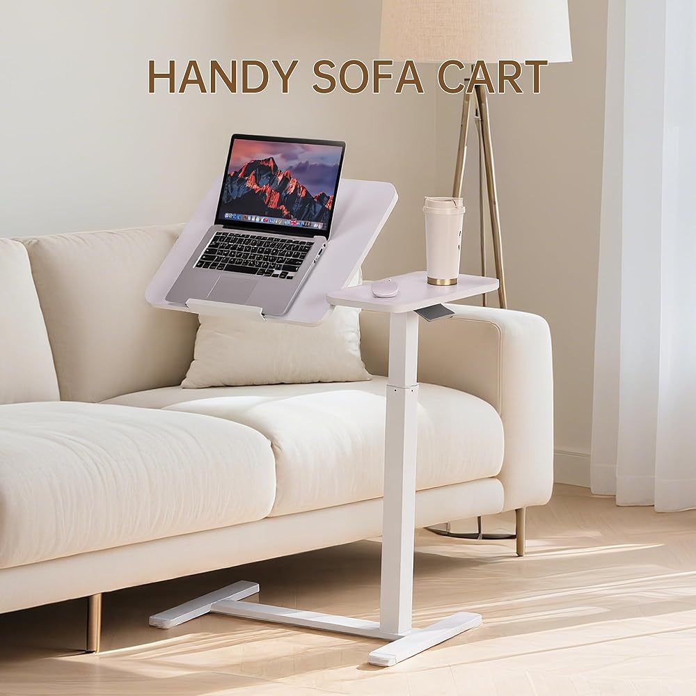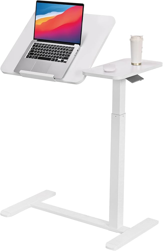 Adjustable Tilt Overbed Table with Hidden Wheels, Mobile Standing Laptop Desk, Portable Pneumatic Computer Cart, Rolling Medical Bed Side Table for Hospital and Home Use, White