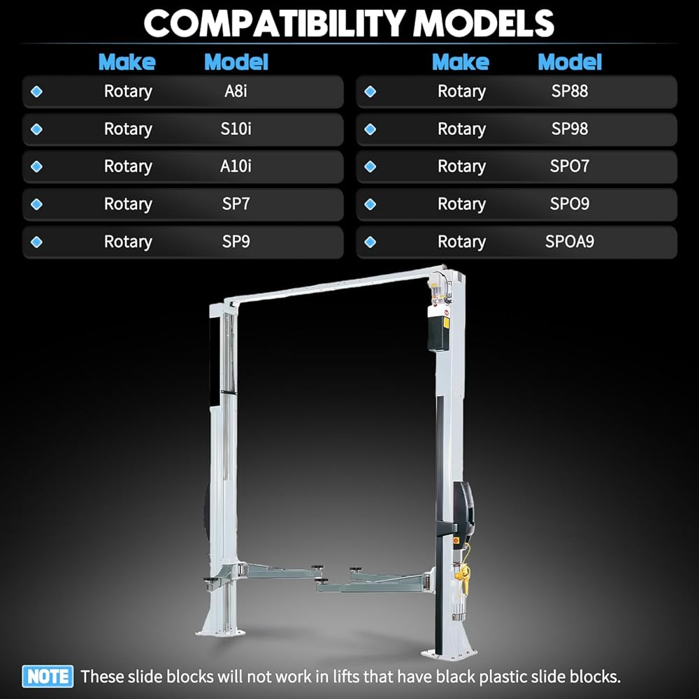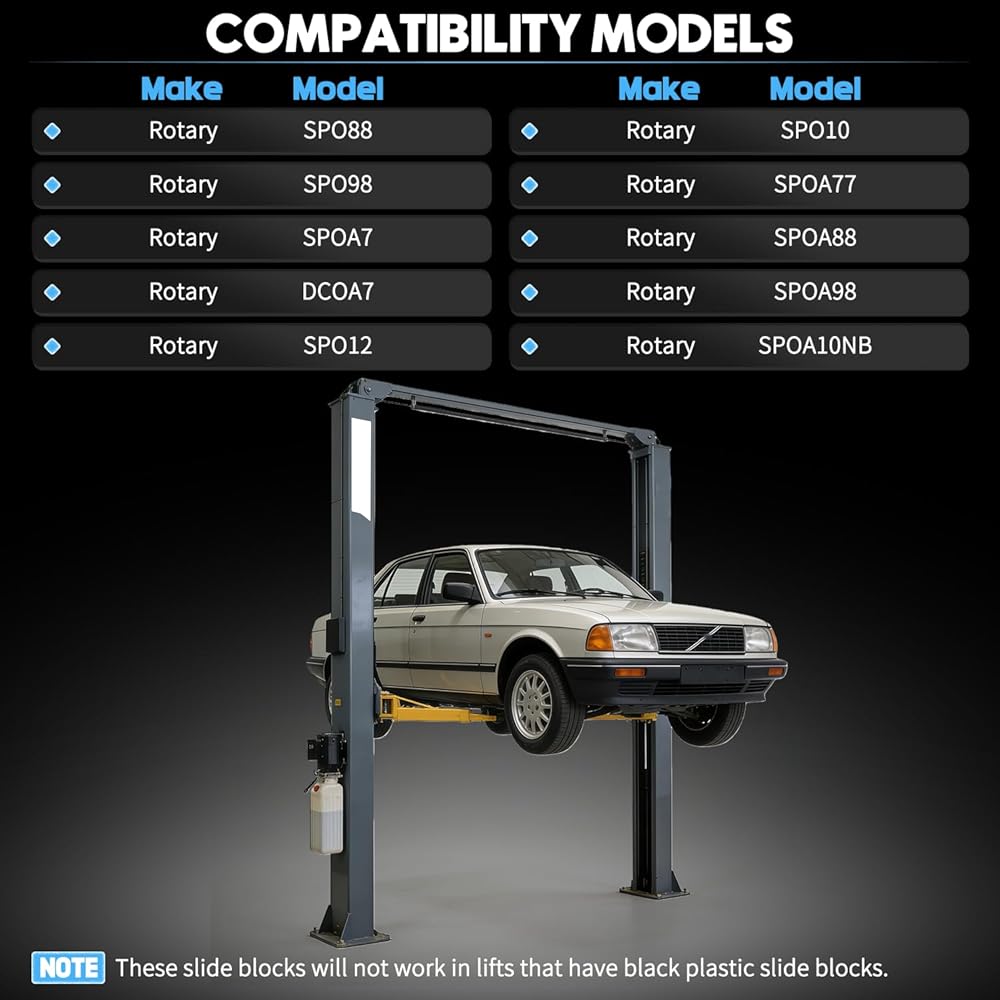• 【Compatibility Vehicles】Fit For Rotary SPO9 200 Series (EH-1), Fit For Rotary SPO9 200 Series (EH-2), Fit For Rotary SPO9 200 Series (EH-4), Fit For Rotary SPOA7 200 Series (EH-1),Fit For Rotary SPOA7 200 Series (EH-2), Fit For Rotary SPOA7 200 Series (EH-4), Fit For Rotary SPOA9 200 Series (EH-1), Notes:These slide blocks will not work in lifts that have black plastic slide blocks.This kit includes 4 slide blocks and 8 shims for most Rotary 2 post surface lifts. You will need one kit per lift column, so you will need 2 kits if you want to do the entire lift