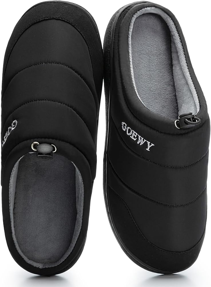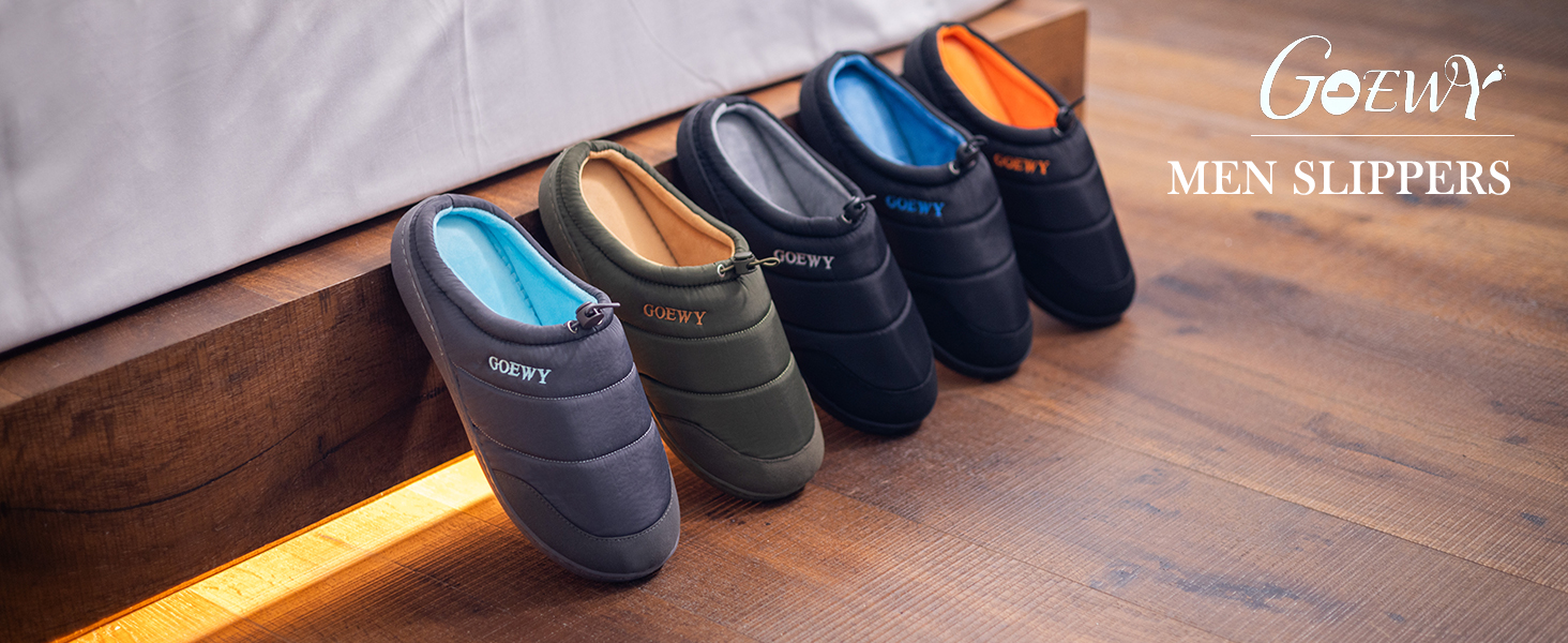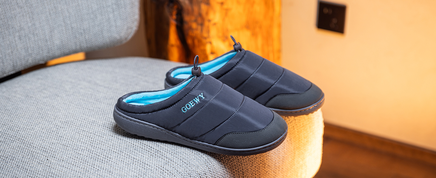 Original design slippers: Classic men's closed-toe slippers,with a fashionable and high-quality fabric on the upper and the GOEWY brand name sewn on it.Unique in style, simple and elegant,it is lined with soft cotton and wool,keeping your feet warm and comfortable in the cold winter.With a drawstring design,it can make your feet fit more closely to the shoes, and they won't slip off your feet even when you walk around freely.