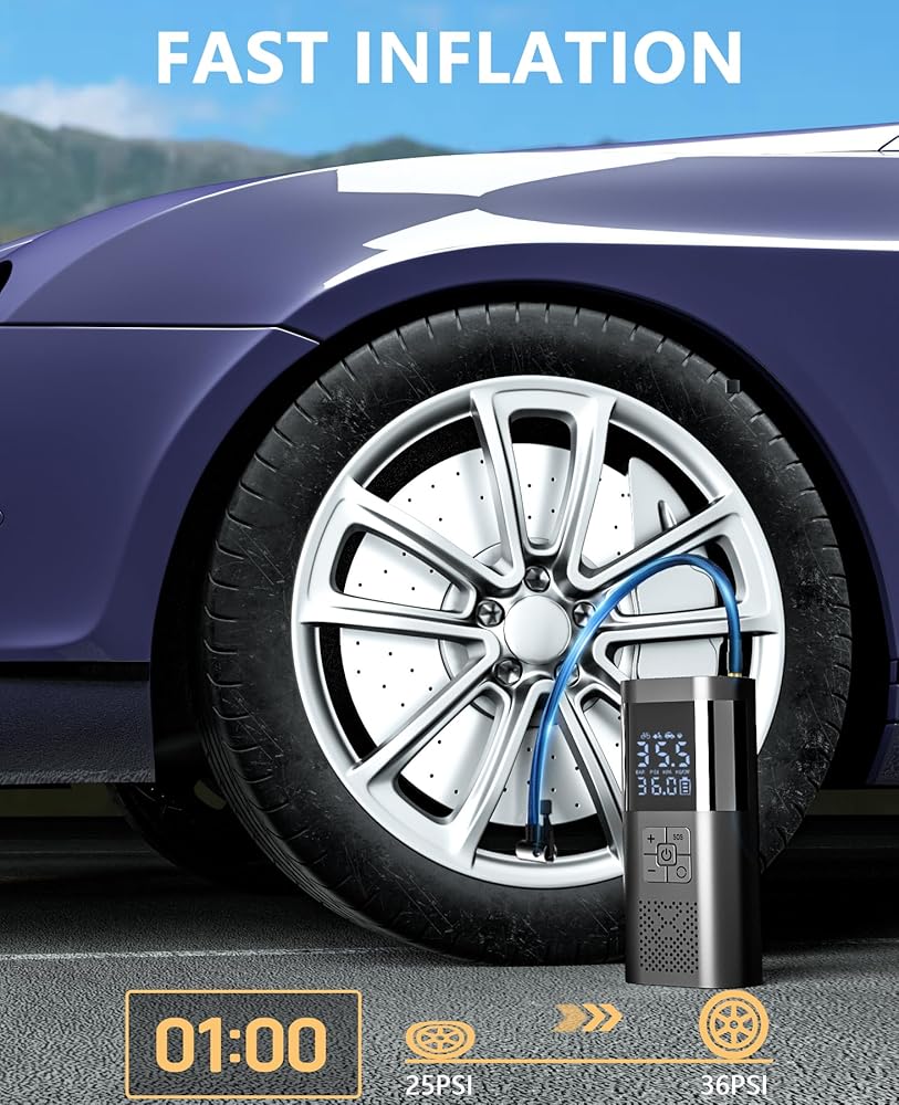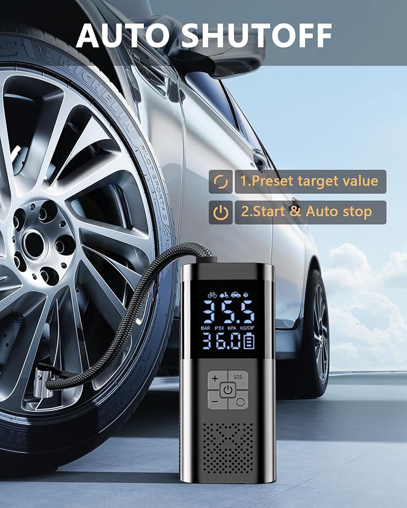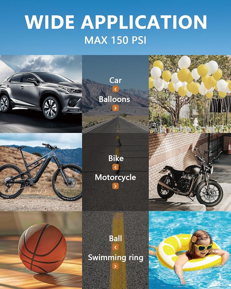 ضاغط هواء عالي الكفاءة بسعة 150 رطل لكل بوصة مربعة: مزود ببادئ تشغيل احترافي مع ضاغط هواء، توفر هذه الوحدة تدفق هواء بحد أقصى 32 لتر/دقيقة وضغط يصل إلى 150 رطل لكل بوصة مربعة. نفخ إطارات السيارات والدراجات النارية والدراجات الهوائية والكرات الرياضية والمطاطية بسرعة. تشمل الوحدات المدعومة PSI أو BAR أو KPA أو KG/CM2.