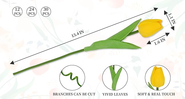 مادة وحجم التوليب: مصنوع من البولي يوريثين عالي الجودة، مع سلك فولاذي بالداخل وبولي يوريثان بالخارج من أجل تشذيب مرن. الارتفاع الإجمالي: 13.4 بوصة، قطر برعم الزهرة: 1.2 بوصة. يتضمن كل ساق برعمًا واحدًا وورقتين. يرجى ملاحظة أن رؤوس الزهور وسيقان تنسيقاتنا يتم دمجها معًا بشكل دائم من أجل السلامة الهيكلية. إذا كنت تخطط لتعديل التصميم لمشاريع DIY، فيمكنك قص السيقان بعناية باستخدام الأدوات المناسبة