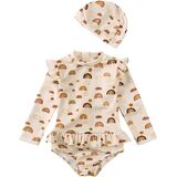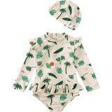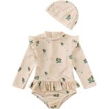 Feature: Girls Long Sleeve Ruffle Swimsuit One Piece Swimwear Cartoon Graphic Printed Rash Guard Shirt with Hat