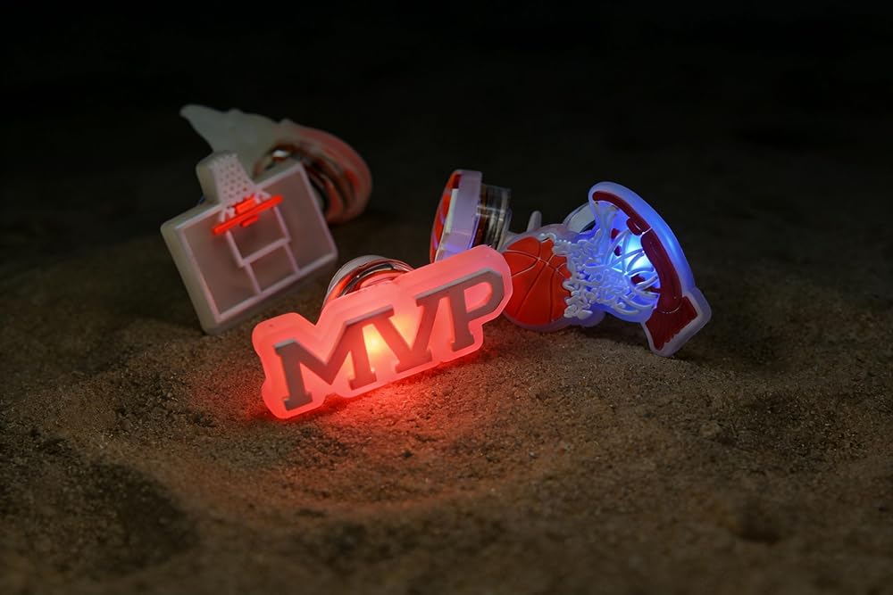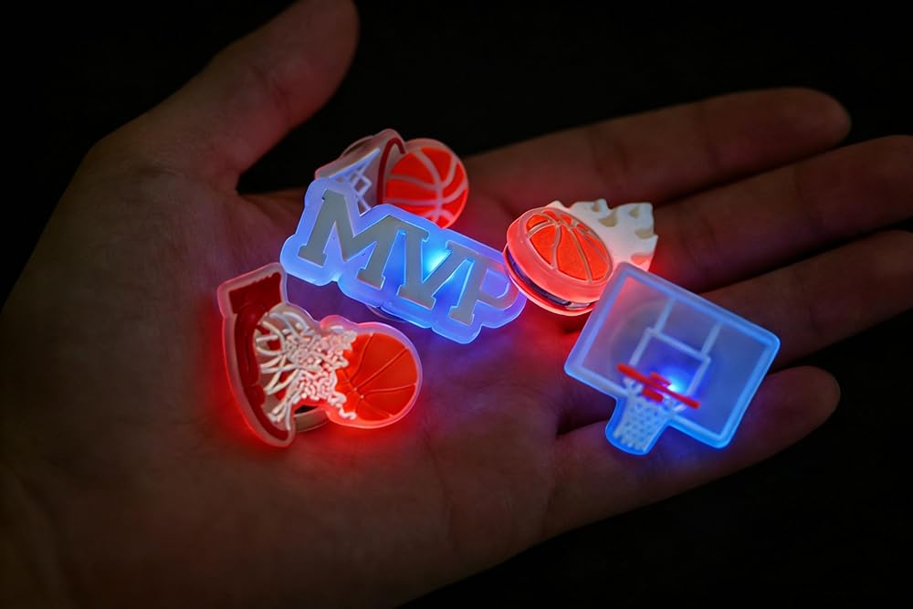 If you are a passionate basketball enthusiast and eager to integrate your favorite sports elements into your outfit, this is definitely your ideal choice. The set is carefully designed with 5 core basketball shapes including MVP letters, basketball hoop, and basketball backboard. Each style carries love for basketball, making your clogs bid farewell to monotony and become a mobile "basketball court" that shows your personality. What's more worth mentioning is that all 5 Shoe Charms are equipped with , and adopt an . No manual switch is needed; slight vibrations such as walking and running can trigger the lighting, and the light color switching is soft and natural. Whether you are going out at night, doing sports, or attending a basketball-themed party, you can become the focus and easily lead the sports trend. The product is made of , which has passed strict quality inspection, is drop-resistant, wear-resistant, and not easy to deform or fade. The can easily cope with daily splashing water, rainy days and other scenarios, making it more assured to use. The LED lamp beads have stable brightness, sensitive vibration sensing and long battery life, which can be used with confidence in daily walking and light sports scenarios. Whether you want to add features to your own clogs or give them as gifts to basketball fan friends around you, this light-up basketball Shoe Charm set is an excellent choice with both appearance, practicality and commemorative significance.