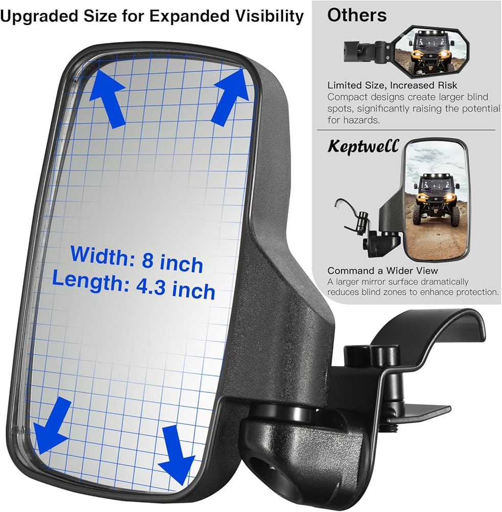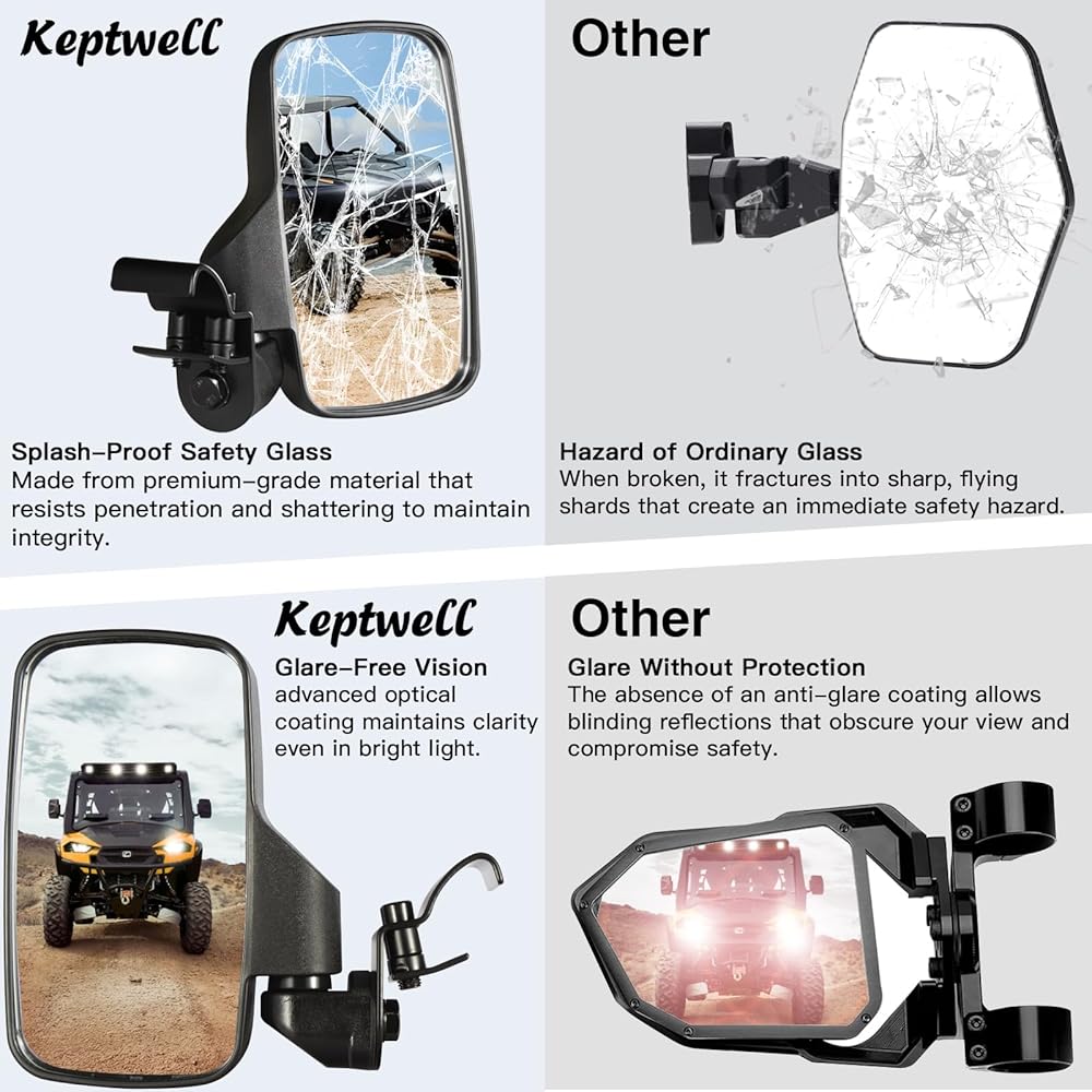 【تصميم مقاوم للكسر وزاوية واسعة ومضاد للوهج】 مصنوعة من هيكل ABS عالي التأثير، وتتميز مرآة Keptwell الجانبية بعدسة محدبة مقاومة للرذاذ مصممة للحماية المزدوجة: تمنع التشتت الخطير عند التأثير وتتضمن طلاء مضاد للوهج لتقليل الانعكاسات القاسية. يوفر هذا المزيج رؤية خلفية واسعة وواضحة ومريحة لتعزيز السلامة في جميع الظروف.