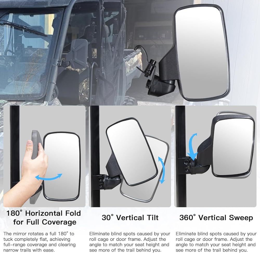 【طي أفقي 180 درجة وإمالة رأسية 30 درجة】 تم تصميمه لتحقيق أقصى قدر من التنوع والسلامة. يمكن طي رأس المرآة بزاوية 180 درجة أفقيًا لتجنب عوائق الطريق والإغلاق للتخزين. بشكل مستقل، يوفر إمكانية تعديل الإمالة الرأسية بمقدار 30 درجة، مما يسمح لك بمحاذاة الرؤية ذات الزاوية الواسعة بدقة مع وضع جلوسك المحدد، مما يقلل بشكل كبير من النقاط العمياء لتعزيز السلامة.