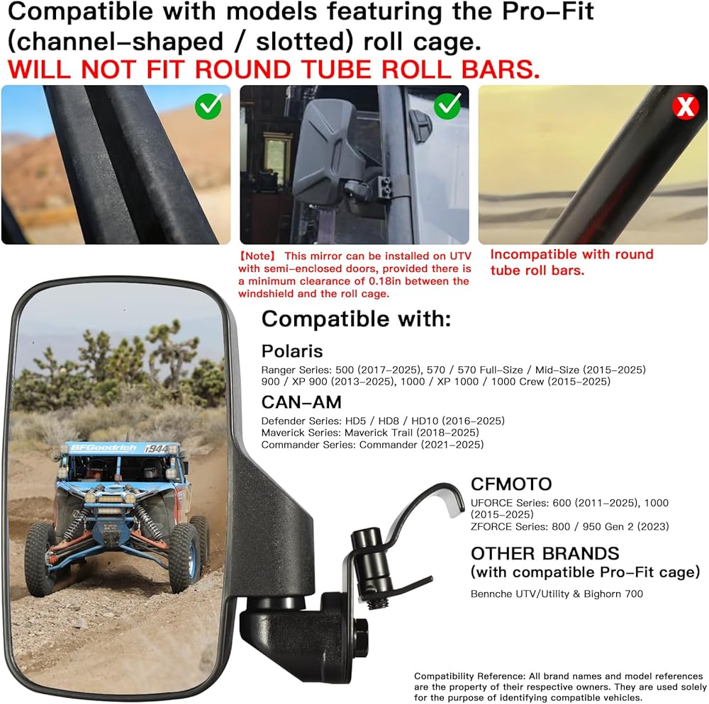 متوافق مع الموديلات التالية (يجب أن تحتوي على شريط مضاد للدوران محدد/مشقوق): 【Polaris】 Ranger 570 بالحجم الكامل والحجم المتوسط (2015-2024) Ranger 900 / XP 900 (2013-2024) Ranger 1000 / XP 1000 (2015-2024) General 1000 (2016-2024) 【Can-Am】 Defender (2016-2024) Maverick Trail (2018-2024) 【CFMOTO】 UFORCE 600 / 1000 (2011-2024) ZFORCE 800 / 950 Gen.2 (2023) 【العلامات التجارية الأخرى】 Bennche UTV/Utility & Bighorn 700 ملاحظة مهمة 【يرجى ملاحظة: هذا المنتج مخصص خصيصًا مصمم للطرز ذات شريط مانع للالتفاف مشقوق (نوع Pro-Fit). لن يناسب: 】 قضبان لف أنبوبية أسطوانية أو مستديرة. موديلات بأبواب كاملة وزجاج أمامي. تم تجهيز Polaris Rangers بأبواب طاقم من القماش.