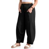 These barrel harem pants are designed with a soft, stretchy waistband and adjustable drawstring. Loose Fit Tapered Leg Linen Pants roomy hip area and tapered ankle, creating a flattering modern silhouette combining effortless movement with a structured look suitable for casual or outdoor outfits