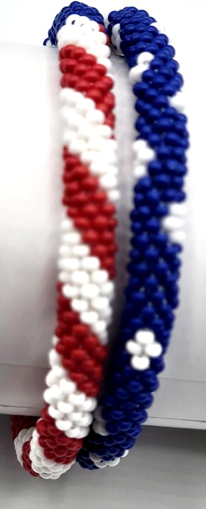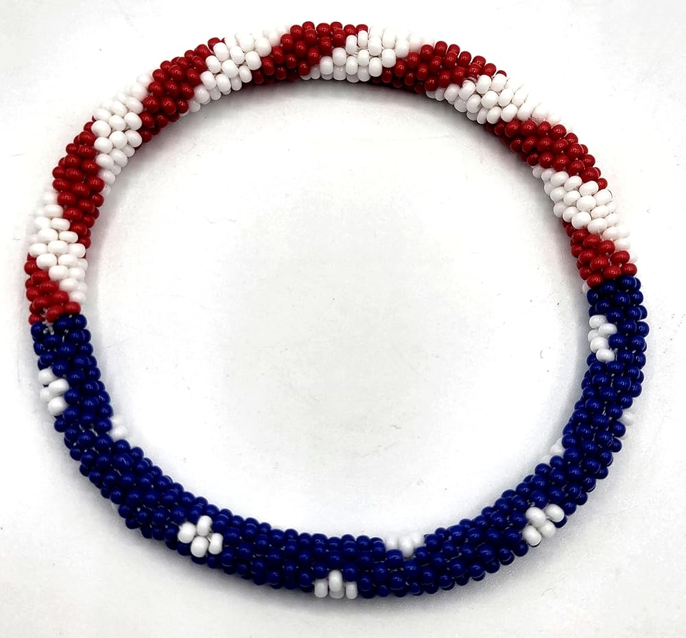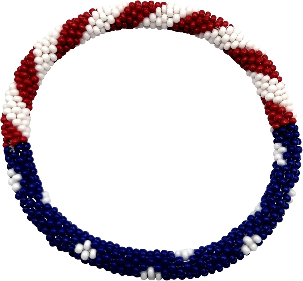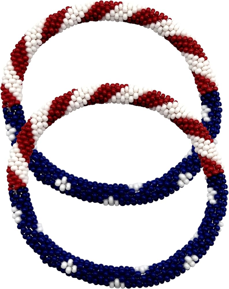 Show your patriotic spirit with these beautifully handcrafted glass beaded bracelets featuring the American flag's iconic red, white, and blue colors. Each bracelet in this set of 2 is meticulously created using high-quality Czech glass seed beads, carefully strung together in a traditional Nepal crochet technique. The durable design measures 7 inches around with just enough stretch to roll comfortably over your hand, making them perfect for most wrist sizes. The intricate beadwork creates a striking pattern that works beautifully whether worn individually for a subtle statement or stacked together for a bolder look. These versatile accessories complement both casual and dressy outfits, suitable for everyday wear or special patriotic occasions. Each bracelet is handcrafted with precise attention to detail, ensuring the beads stay securely in place while maintaining their brilliant appearance. The bangle-style design offers easy wear and removal, while the lightweight construction ensures all-day comfort. These bracelets represent both fine Nepal artisanship and American pride, making them a meaningful addition to any jewelry collection.