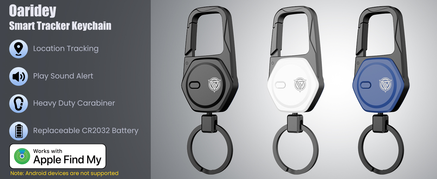 سلسلة مفاتيح Oaridey Key Finder (iOS فقط) مع حلقة تسلق شديدة التحمل، تعمل مع Apple Find My، سلسلة مفاتيح رفيعة للأمتعة، علامة تعقب معدنية متينة مع عمر بطارية يدوم عامين، عالية الدقة، سوداء